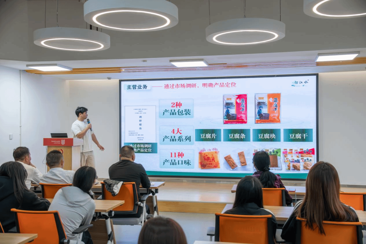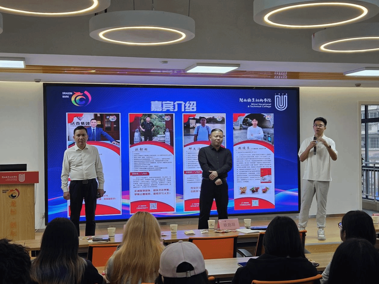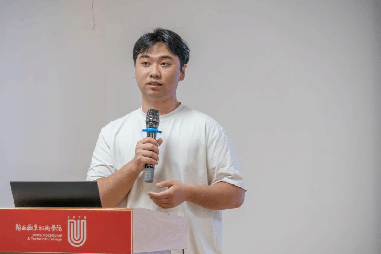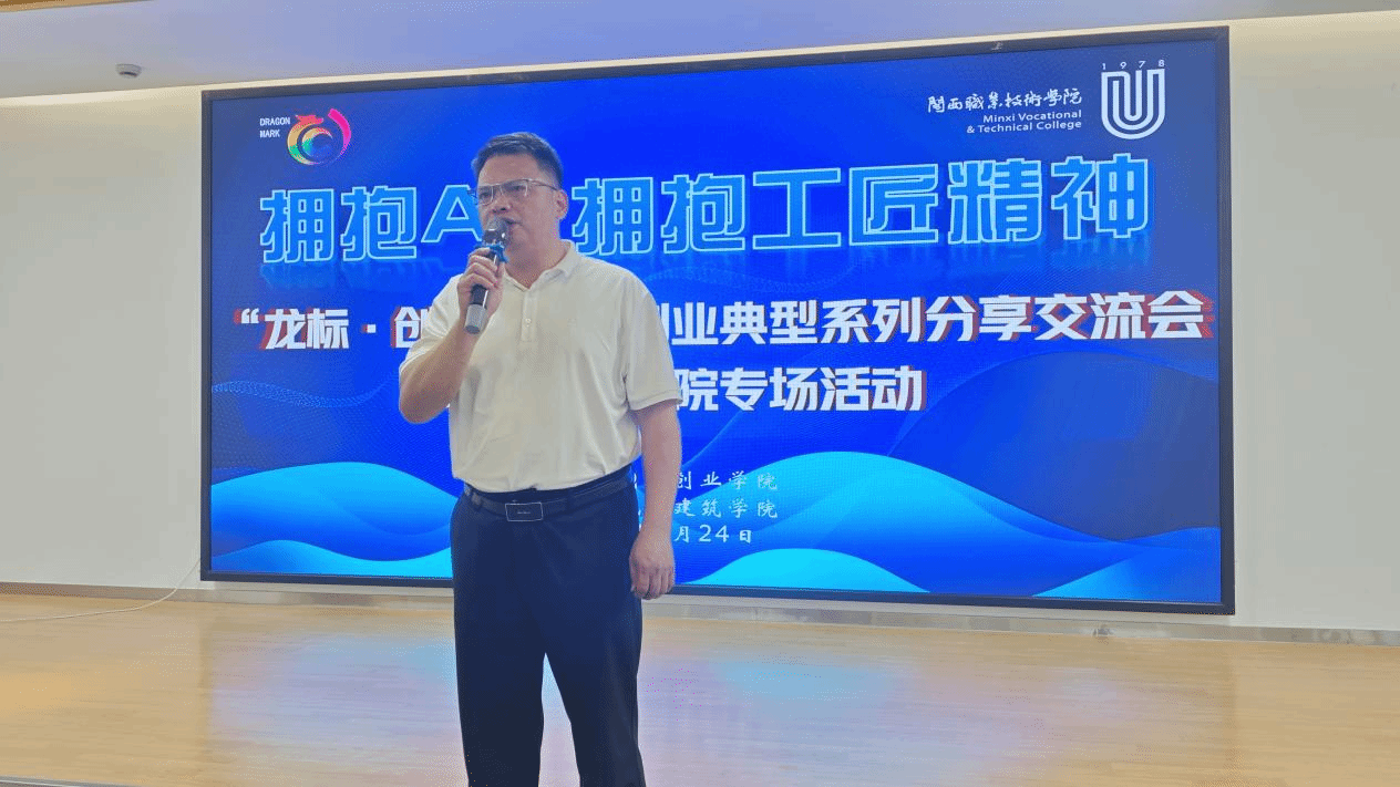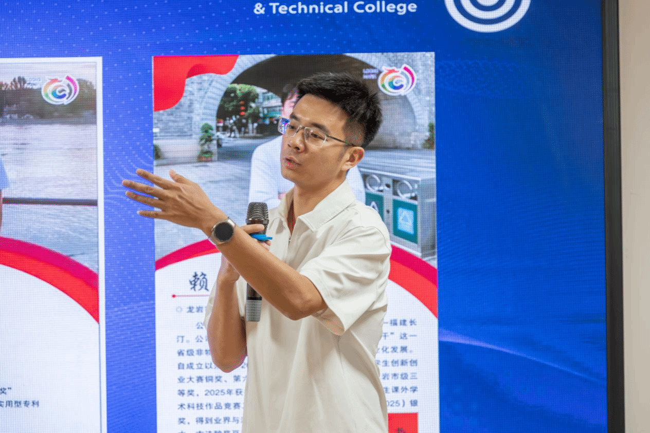 23级建筑工程技术专业学生、龙岩市汀江水食品有限公司法人赖俊良登台分享,讲述在校创业的实践经历与成长心得,为在场学子树立身边的创业标杆。