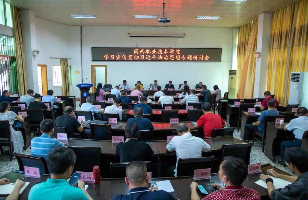 在研讨会第一阶段(2022年9月中旬至9月下旬),依法治校领导小组成员登录“福建干部网络学院”参加《习近平法治思想网络专题培训班》课程及“学习强国”学习平台专栏开展线上学习。9月27日下午在协成楼二楼会议室召开专题研讨交流会。参加会议的有校领导班子成员,校党政、教辅部门主要负责人(含主持工作负责人),各二级学院党委书记、院长,龙岩卫校校长,集中研讨会交流发言代表,共43人。专题研讨会由校党委委员、副校长刘路永主持。