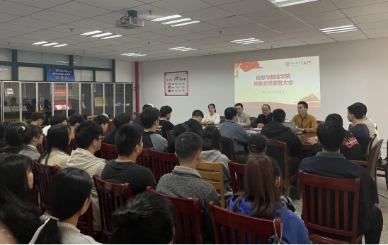 近日,信息与制造学院在实训楼6楼会议室举行预备党员宣誓大会暨党性教育活动。26名预备党员面向鲜红的党旗庄严宣誓,40余名入党积极分子列席此次活动。