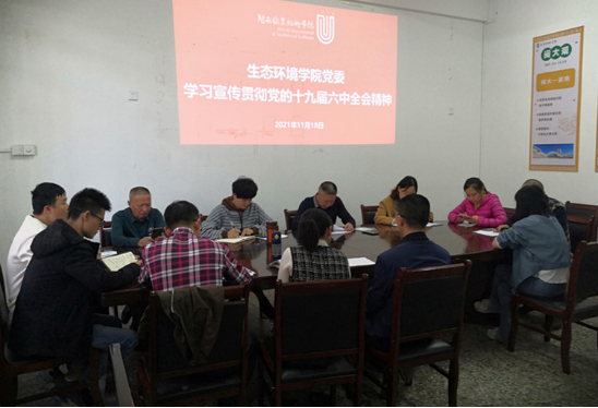 11月18日,生态环境学院党委召开十九届六中全会精神专题学习会。院领导班子、党委成员、支部书记、专业主任参加会议。会议重点学习了《中共中央关于党的百年奋斗重大成就和历史经验的决议》,传达了学校学习贯彻十九届六中全会精神的要求。