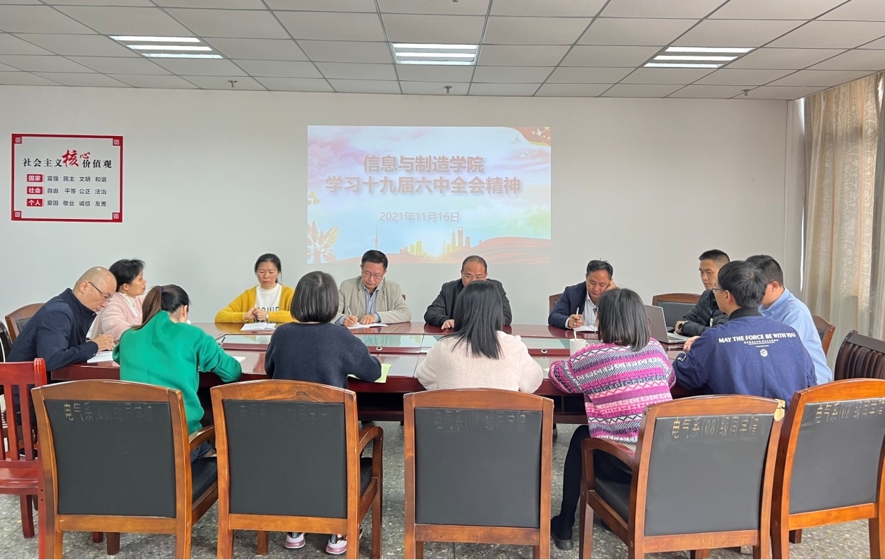 为深入学习党的十九届六中全会精神,推动全会精神入脑、入心、入行,11月16日,信息与制造学院党委在实训楼602会议室组织开展党的十九届六中全会精神专题学习会。该院全体党委委员、各支部书记、全体辅导员参加学习。