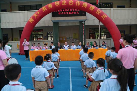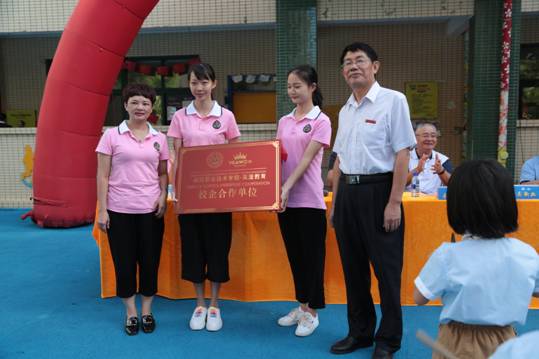 副校长吴新业、执行总监饶宝珍代表校企双方共同为MG冰球突破官网学前教育实训基地、MG冰球突破官网&英湟教育校企合作单位揭牌。