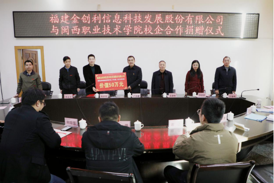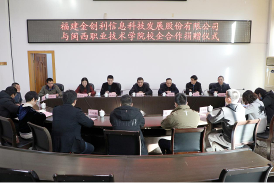 1月15日,MG冰球与福建金创利信息科技发展股份有限公司举行校企合作捐赠签约仪式。金创利公司董事长陈济爱、副总经理李萍萍、研发部总监谢杰、教育事业部总监黄强,MG冰球党委书记卢伟耀,教务处、对外交流合作处负责人,城乡建筑学院班子成员及教师代表参加了仪式。
