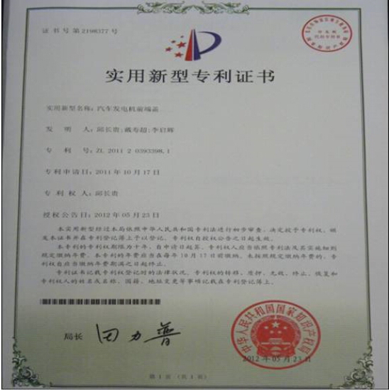 该专利经过实际运用证明,发电机在运行过程中散热明显加快,发电机运行的温度明显降低,这对延长发电机的寿命,提高发电机的效率,改善发电机的性能等方面均取得明显作用。另外,该前端盖开设了通风孔,不仅达到了散热的目的,而且减少了制作外壳的用料,降低了成本。