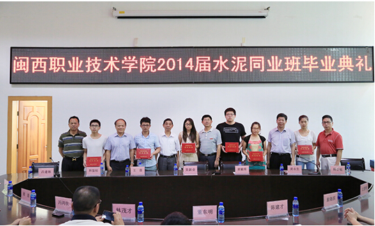 2014年6月11日上午,我院2014届龙岩市水泥同业班毕业典礼在办公楼二楼会议室举行。副院长吴新业、水泥同业商会秘书长黄毓荣、福建省永定闽福建材有限公司董事长王苗、福建龙麟集团有限公司副总经理黄永生、福建春池集团新丰水泥有限公司总经理林鉴标、福建蓝田水泥有限公司副总经理杨春魁等出席典礼。参加典礼的还有学院办公室、教务处、学工处、校企处、机械工程系、化学工程系负责人,辅导员及2014届水泥同业班全体毕业生。毕业典礼由教务处负责人吕建林主持。