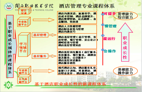 (2)构建以职业能力发展为导向的课程体系。根据学生就业岗位群所需要的职业能力,结合酒店企业的专业标准,融合创新创业、工匠精神,依据旅游服务专业群中职业基本能力-职业通用能力-职业专项能力-职业拓展能力课程体系,建立相对应的四个课程模块,即公共基础课程-群平台课程-专业方向课程-群选修课程。校企双方围绕职业成长型的人才培养目标,根据“会操作—能运行—懂管理—可提升”的职业成长过程制定学习内容。