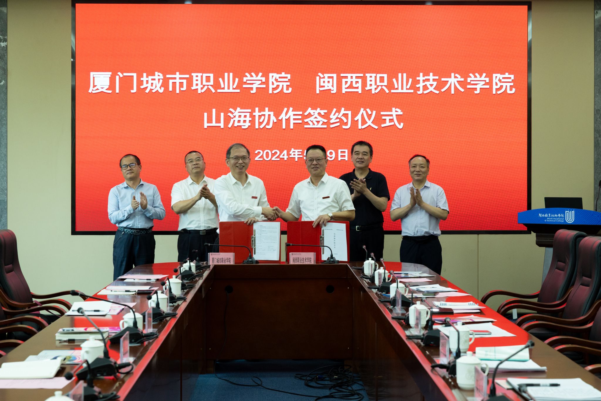 会上,两校出席人员共同观看学校宣传片,卢伟耀书记对厦门城市职业学院一行表示热烈欢迎并高度赞扬该校办学综合实力,他说两校渊源深厚、情意绵长,师生往来交流密切,此次交流活动既加深了两校的情感交流,更是抢抓厦龙携手推进新时代山海协作新的历史机遇的具体举措,将为师生提供更高质量的交流平台,期待两校共同努力打造新时代职业教育山海协作的样板和典范。唐宁校长介绍了厦门城市职业学院办学成效,并希望通过建立常态化的交流机制迅速推动两校合作迈入实质性阶段,双方充分发挥自身优势,在办学治校、师资互访、联合科研项目、共建共享教学资源、学生活动交流等多方面开展更深入更务实的合作。随后,在两校代表的共同见证下,双方签订了山海协作协议书,并围绕多领域协作进行深入交流和探讨。