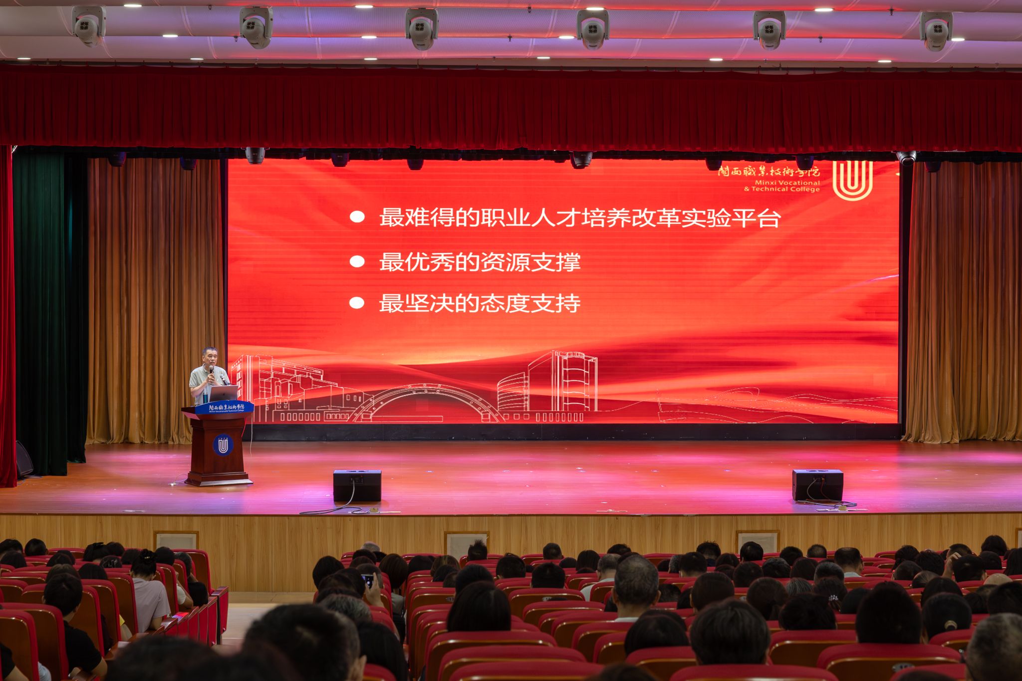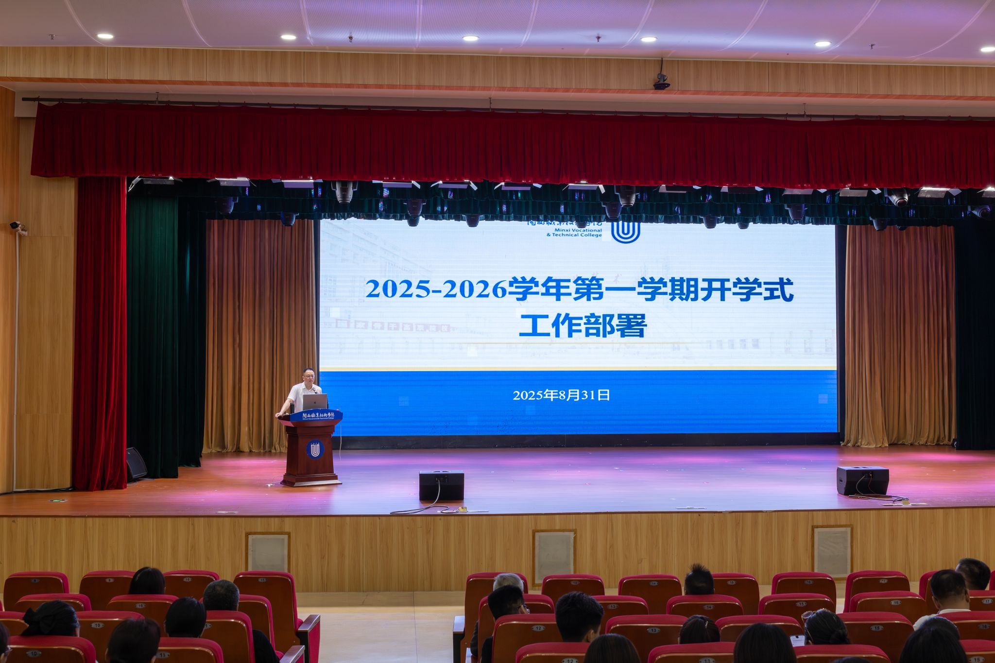 8月31日上午,MG冰球在大匠堂召开2025-2026学年第一学期开学式,全体校领导、全校教职员工参加开学式。