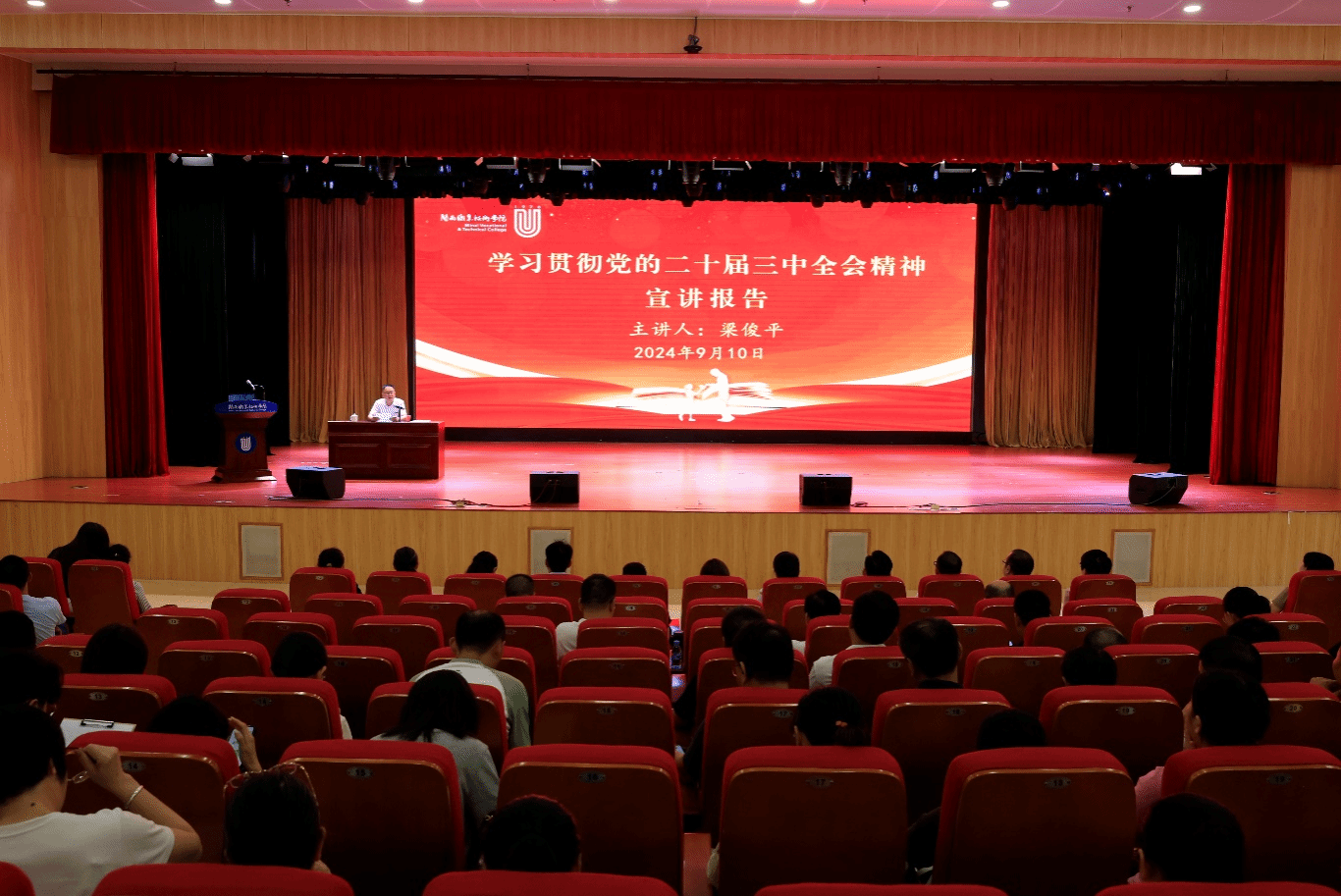 大会的第一项议程是梁俊平校长作“学习贯彻党的二十届三中全会精神”主题宣讲。梁俊平指出,学习贯彻落实党的二十届三中全会精神是我们当前和今后一个时期的一项重大政治任务,要求全体教职员工以钉钉子精神抓好全会精神和各项改革任务的落实,在全校开展“强国复兴有我”“创建职业本科我先行”专题讨论,凝聚全校师生的智慧和力量,打造“予生最好学校”,奋力书写职业教育“闽大”新篇章。