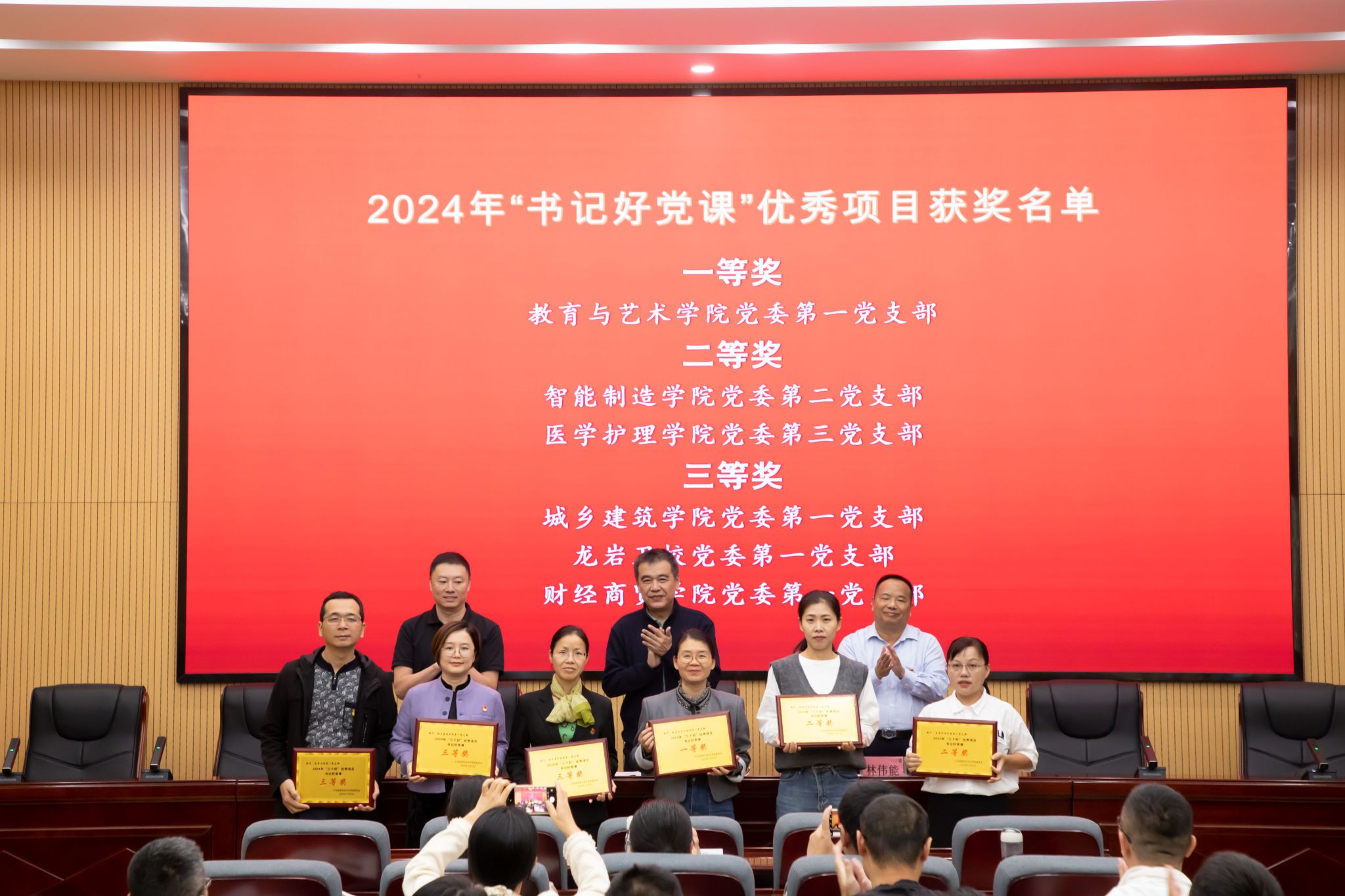 开班式上,学校党委卢伟耀书记、林伟能副书记分别为获得第八轮党支部工作“立项活动”优秀成果奖和获评“党员好故事、书记好党课、支部好案例”的优秀项目奖的支部颁发奖牌。