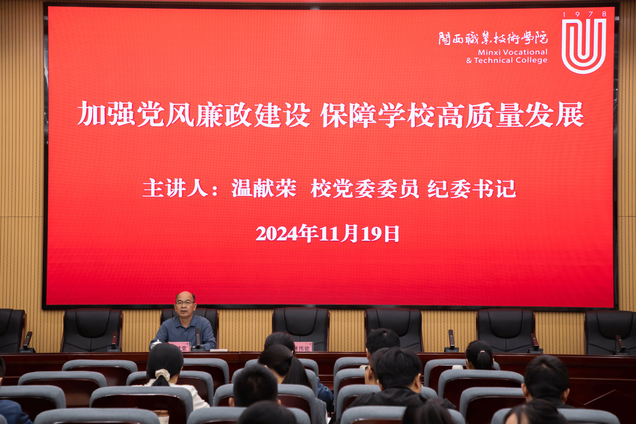 校纪委温献荣书记以《加强党风廉政建设,保障学校高质量发展》为题,强调党务干部要时刻牢记“两个永远在路上”,要以实际行动共同营造风清气正的校园政治生态,引领推进高质量党风廉政建设。