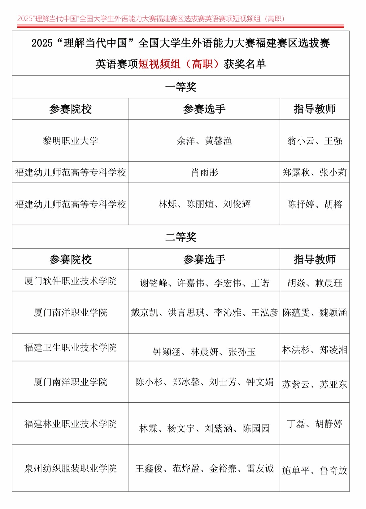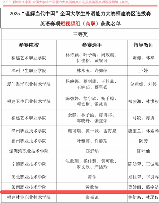 2025“理解当代中国”全国大学生外语能力大赛福建赛区选拔赛结果公布,MG冰球突破官网在英语赛道短视频组(高职组)中荣获三等奖。本次大赛由福建省人民政府外事办公室主办,福建师范大学、华侨大学承办,旨在引导当代大学生深入理解当代中国,讲好中国故事,传播中国声音,展示新时代青年学子的语言能力与国际传播素养。
