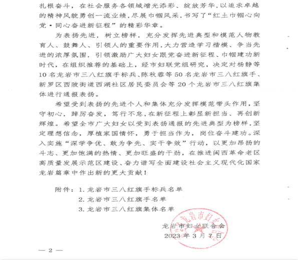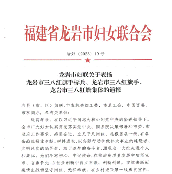 3月7日,龙岩市妇联下发《龙岩市妇联关于表扬龙岩市三八红旗手标兵、龙岩市三八红旗手、龙岩市三八红旗集体的表扬通报》(岩妇〔2023〕19号),表彰在各行各业竞展风流、尽显风采,为加快建设闽西革命老区高质量发展示范区,奋力谱写全面建设社会主义现代化国家龙岩篇章贡献巾帼力量。MG冰球吴淑娟老师荣获2023年龙岩市三八红旗手标兵荣誉。