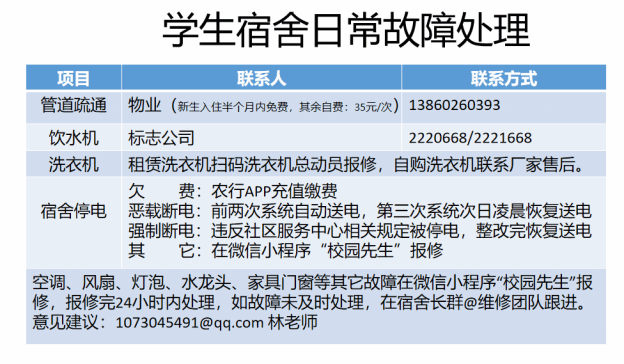 注:团结里公寓楼楼层渗水故障,请在宿舍舍长群报修。