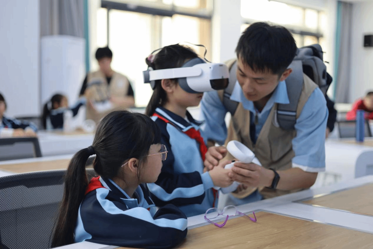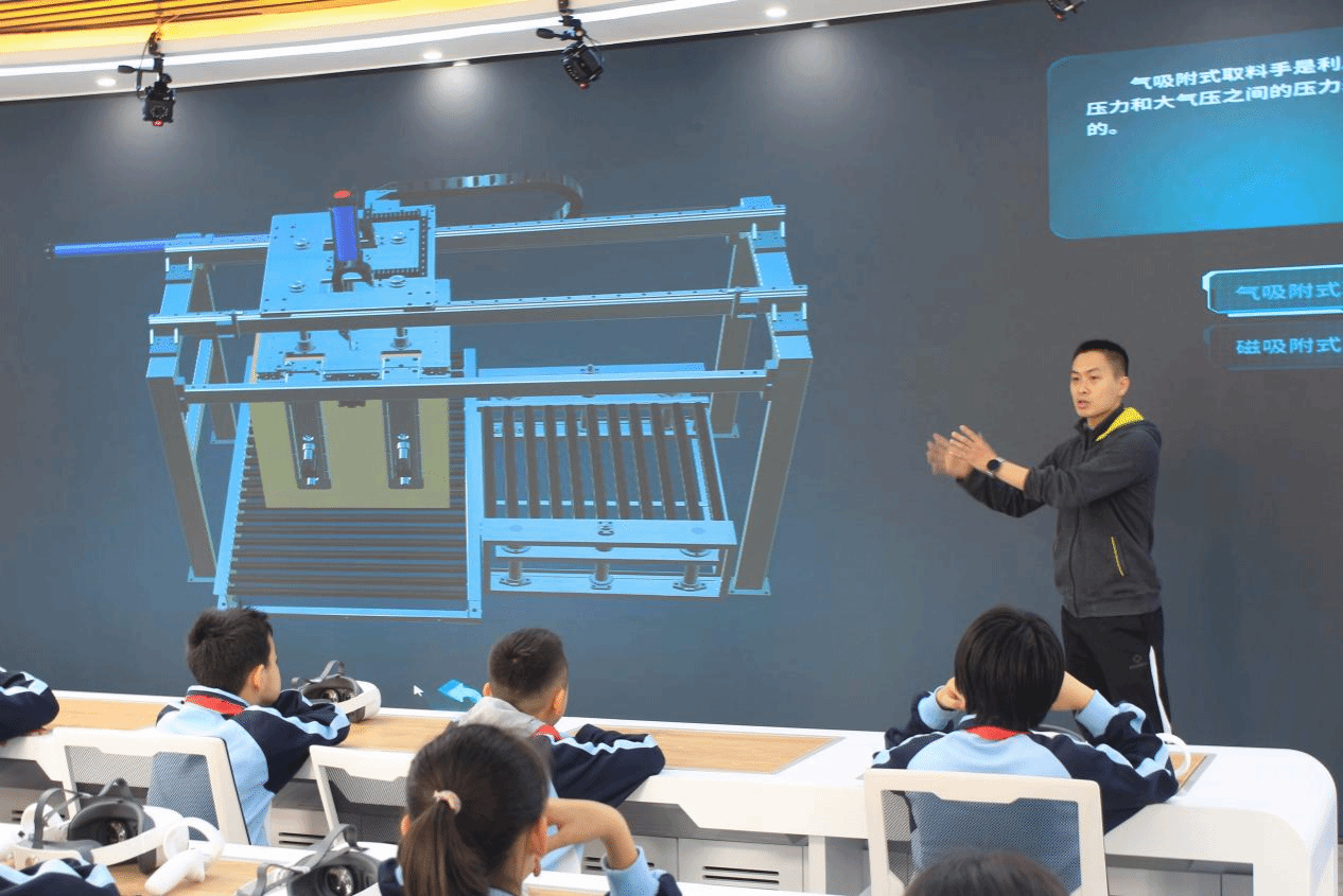 龙岩市科技馆科技辅导员吴海锋老师为来访的同学们讲解了工业机器人在智慧工厂中码垛、焊接、装配、运输、检测等实际应用案例,现场演示了如何使用工业机器人对物体进行视觉识别定位、货物抓取提升运输传递、智能码垛等功能。在虚拟仿真实训室,来访的同学们佩戴上3D眼镜,身临其境去感受未来课堂中的虚拟场景。信息工程学院刘剑友老师通过现场展示和教学,将现代化的AR/VR技术融入到传统的课堂中,利用3D技术将复杂的机械臂夹具、传动系统等机械结构展示成简单的模型,让小学生也能直观的学习理解。