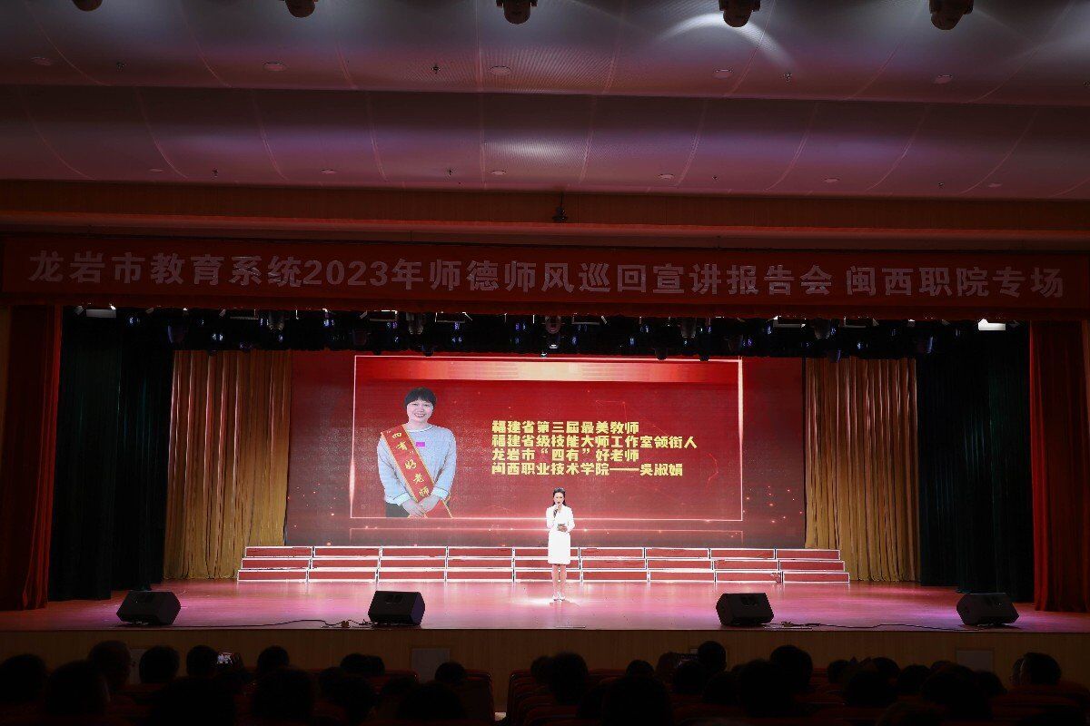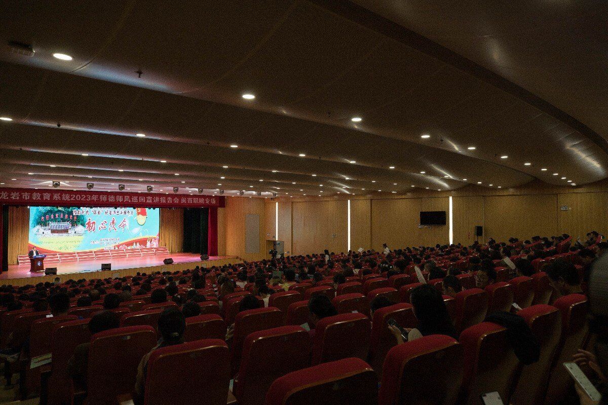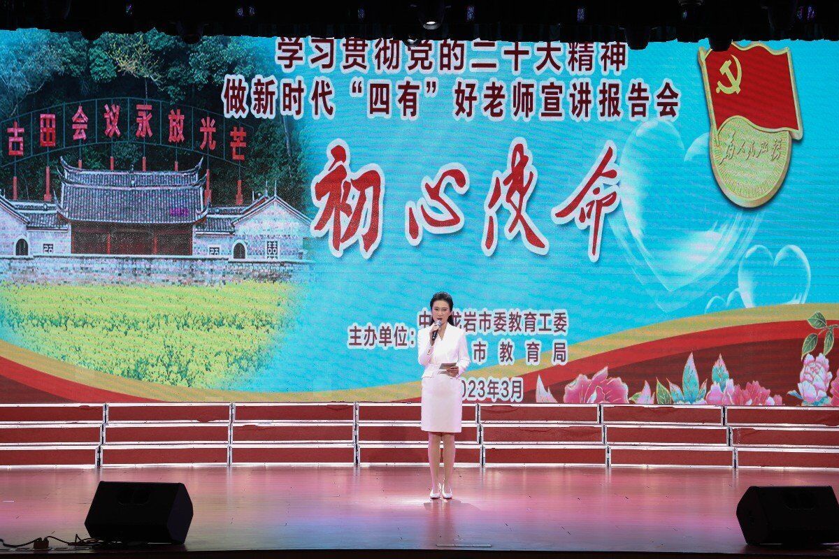 3月23日晚,龙岩市“学习贯彻党的二十大精神 做新时代‘四有’好老师”师德师风巡回宣讲报告会MG冰球突破官网专场,在MG冰球大匠堂举行。副校长刘路永、卢兆梅及全体教职工参加。