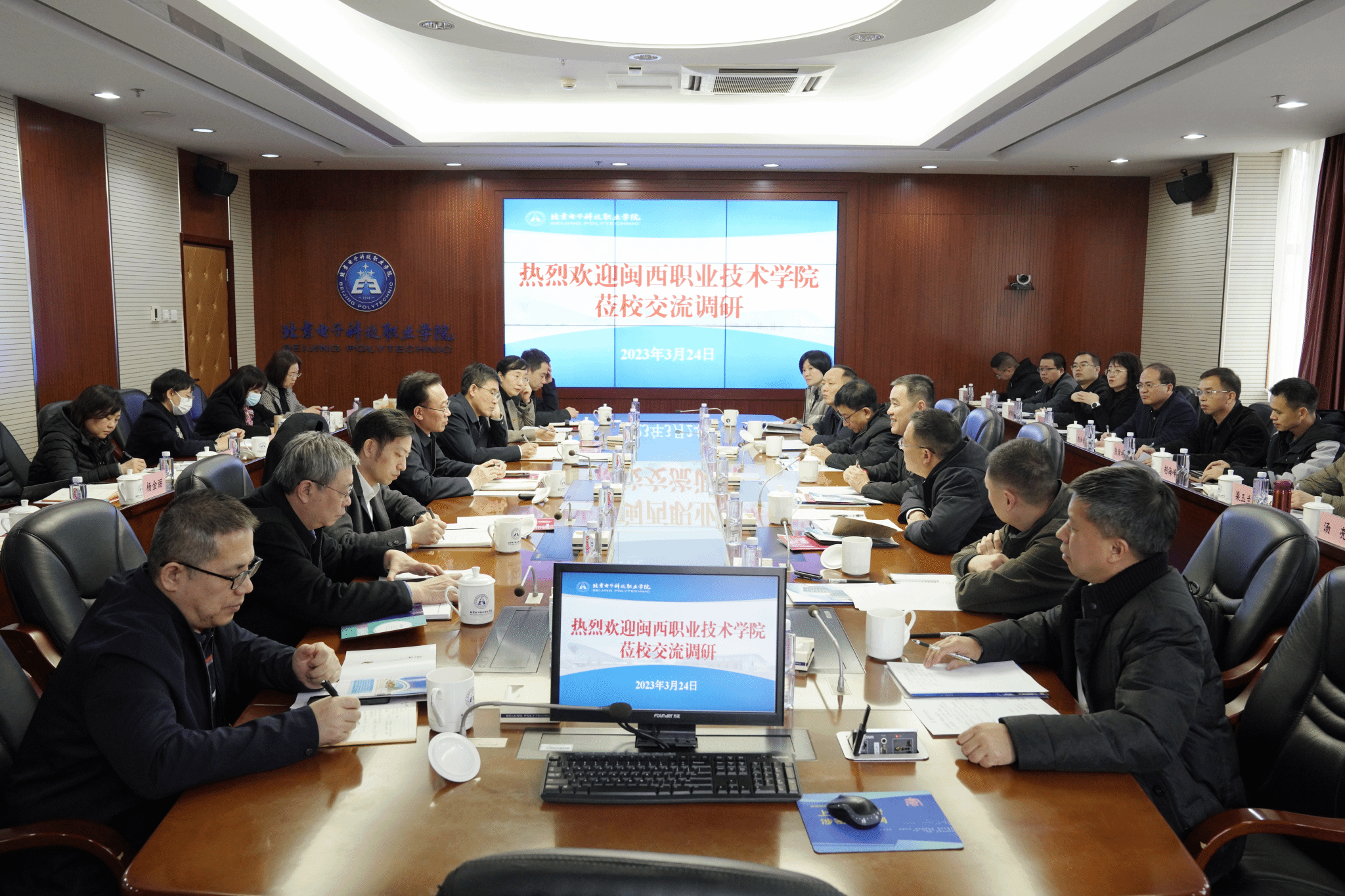 在北京电子科技职业学院,一行人参观了机电工程学院、汽车工程学院、电信工程学院、生物工程学院、艺术设计学院,详细了解了智能制造基地生产车间、集成电路中试基地、化药制剂与蛋白药物研发中试基地等各类专业化产教融合实训基地和应用技术协同创新中心的建设及运行情况,北京电子科技职业学院校长姚光业、副校长朱运利及各相关职能部门负责人随同参观并做了介绍。在座谈会上,北京电子科技职业学院校长姚光业对学习交流团一行的到来表示热烈欢迎,介绍了该校办学成效和办学特色,他希望两校今后进一步加强沟通交流,相互学习,相互借鉴;校党委书记卢伟耀对北京电子科技职业学院的热情接待表示感谢,他指出,近年来北京电子科技职业学院各项事业得到快速发展,各项成果令人印象深刻,成为开发区里办高职的典型样板及国家“双高校”建设的标杆,值得MG冰球认真学习和借鉴,也真诚欢迎北京电子科技职业学院同仁来龙岩传经送宝,同时也接受革命老区的思想洗礼,携手实现高质量发展;校长梁俊平表示,北京电子科技职业学院办学成就显著、成果丰硕,已成为全国高职院校的领跑者和发展样板,希望两校未来能建立起良好的交流合作机制。会后,学习交流团各成员深入到北京电子科技职业学院的对口部门、学院实地参观并深入交流。