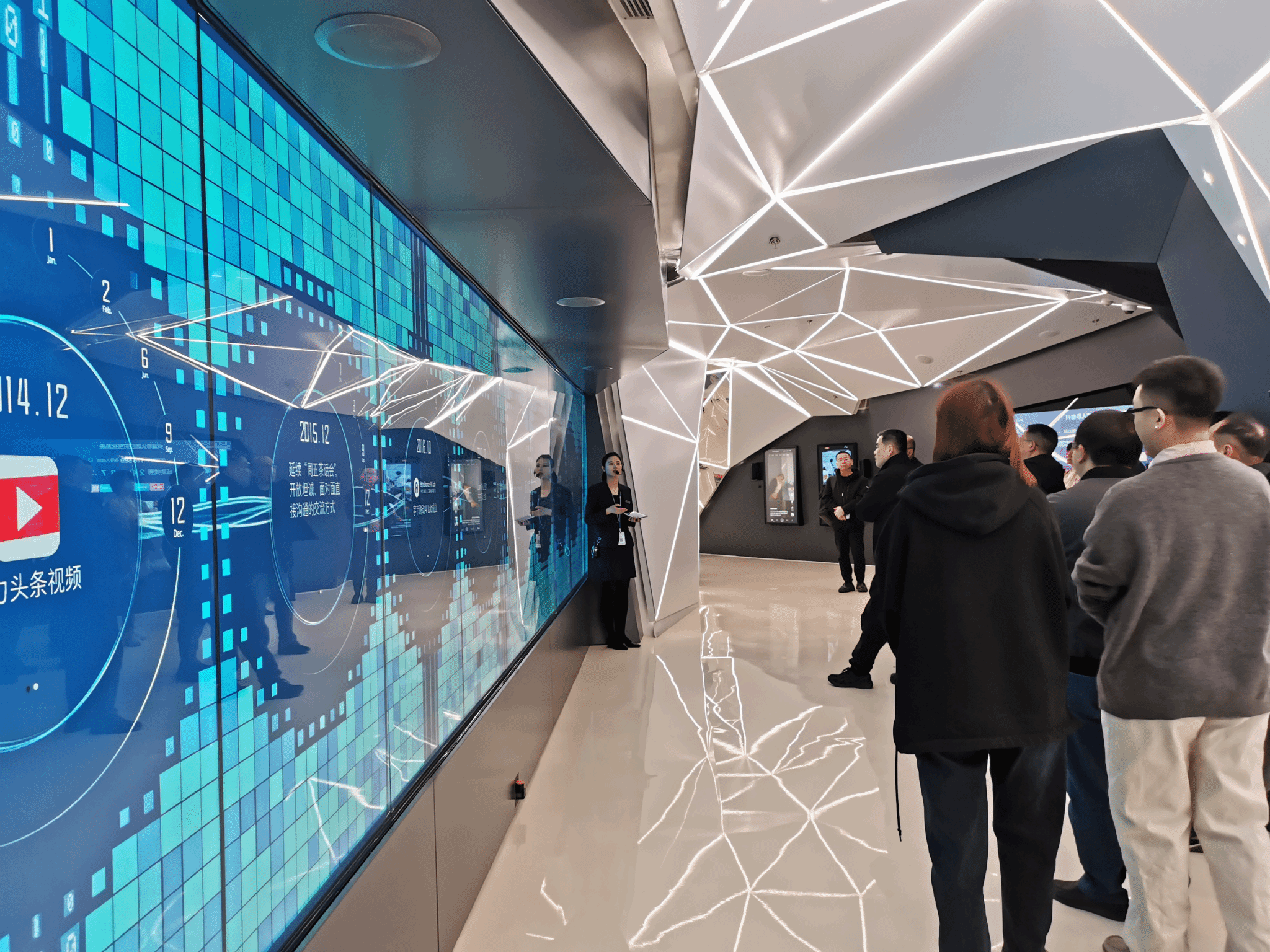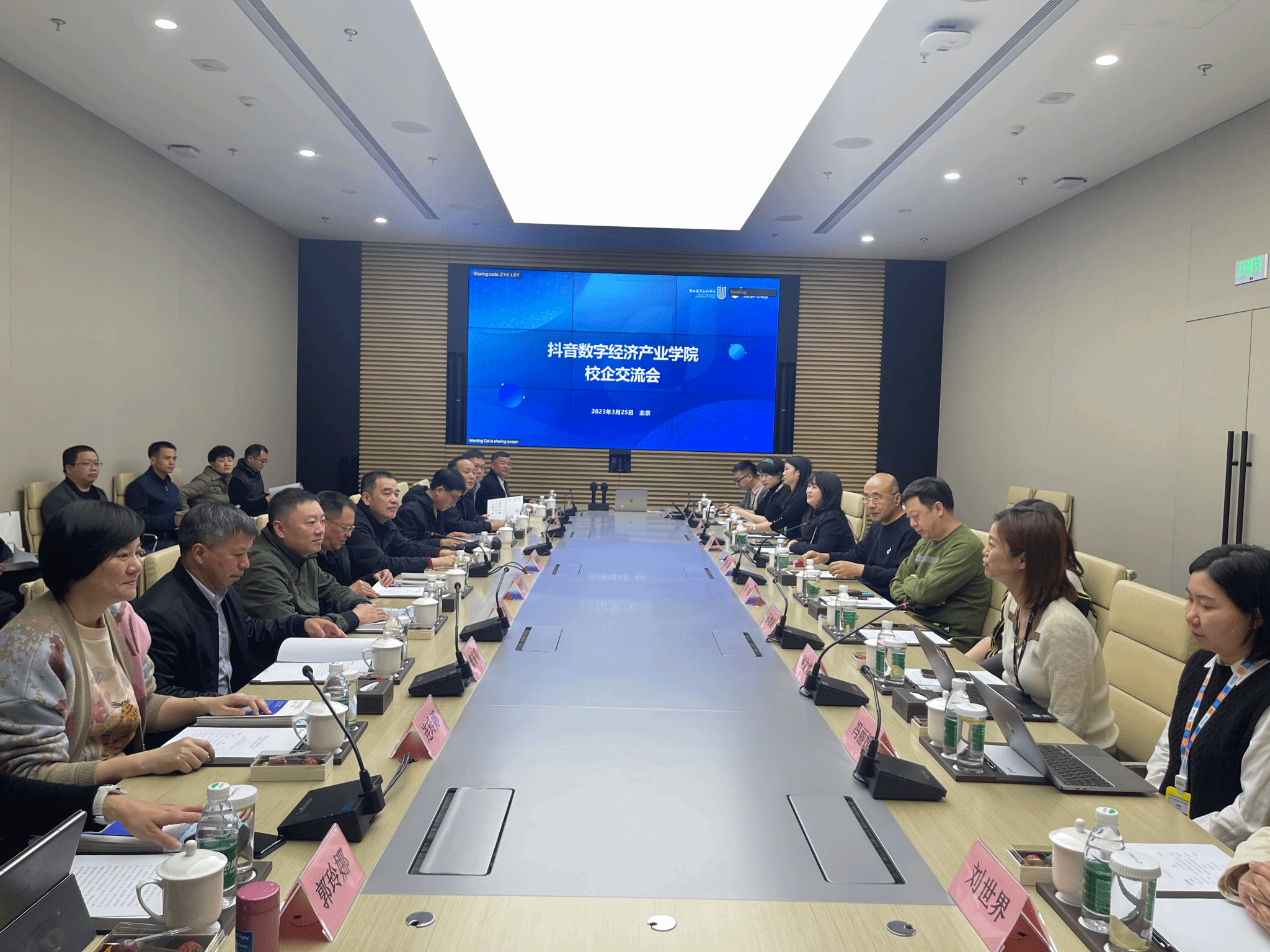 在抖音集团公司总部,学习交流团一行在抖音集团公司副总裁李涛的陪同下参观了抖音集团方恒展厅,看展示、听讲解、进行互动体验,详细了解了抖音集团的发展历程、正在运营的飞书、剪映等互联网产品,抖音数字学堂和乡村英才计划等项目。座谈会上,李涛副总裁详细介绍了抖音集团的发展愿景,财经商贸学院院长郭玲娜、抖音集团企业社会责任部院校产品总监蔡文婷作为抖音数字经济产业学院的校、企两方的代表分别就产业学院建设思路、建设进展以及总体规划向与会人员做了详细的介绍。校党委书记卢伟耀指出,抖音数字经济产业学院项目实施以来,在顶层机制设计、课程试点改革、育人模式升级等各方面都取得新突破、成果喜人,希望双方通过此次交流,持续深化合作关系,将抖音“平台赋能型”合作模式拓展到学校各个二级学院、抖音元素融入到校园的方方面面,从而真正实现“校企融合、坦诚相待、携手向未来”的美好愿景,培养出“身心健康、人格独立、发展有特色”现代阳光工匠;校长梁俊平表示,通过这次交流,对抖音集团产生了新的认知、对抖音数字经济产业学院有了新的定位,未来校企双方应持续深入开展合作,携手打造人才培养模式新样板,共同拓展产教融合新领域,助力学校实现高质量发展。
