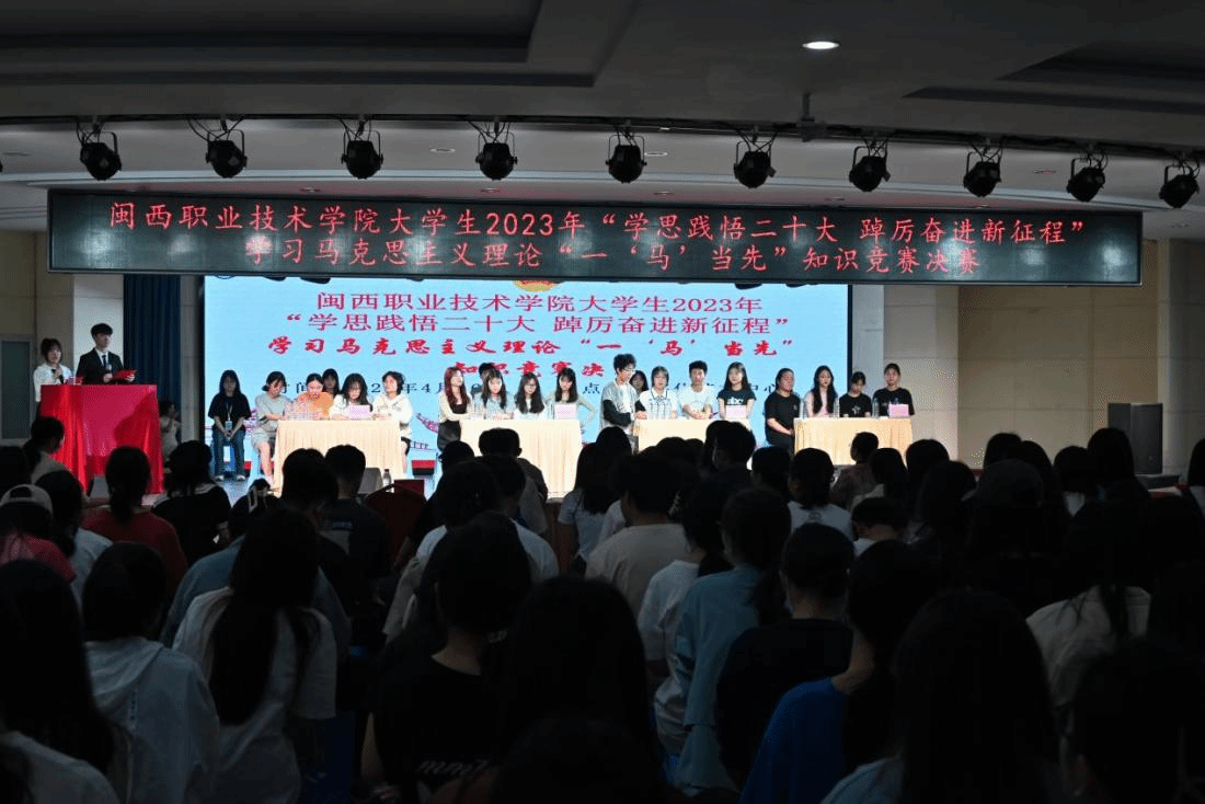 为贯彻落实党的二十大精神,营造闽大学子学习马克思主义理论的浓厚氛围,2023年4月16日上午10点,MG冰球在数字化艺术中心举办马克思主义理论“一‘马’当先”知识竞赛决赛。马克思主义学院副院长林振东教授、李水兰老师、校团委副书记(主持工作)陈愉老师、专职团干傅歆老师,及156位青年学生参加此次活动。