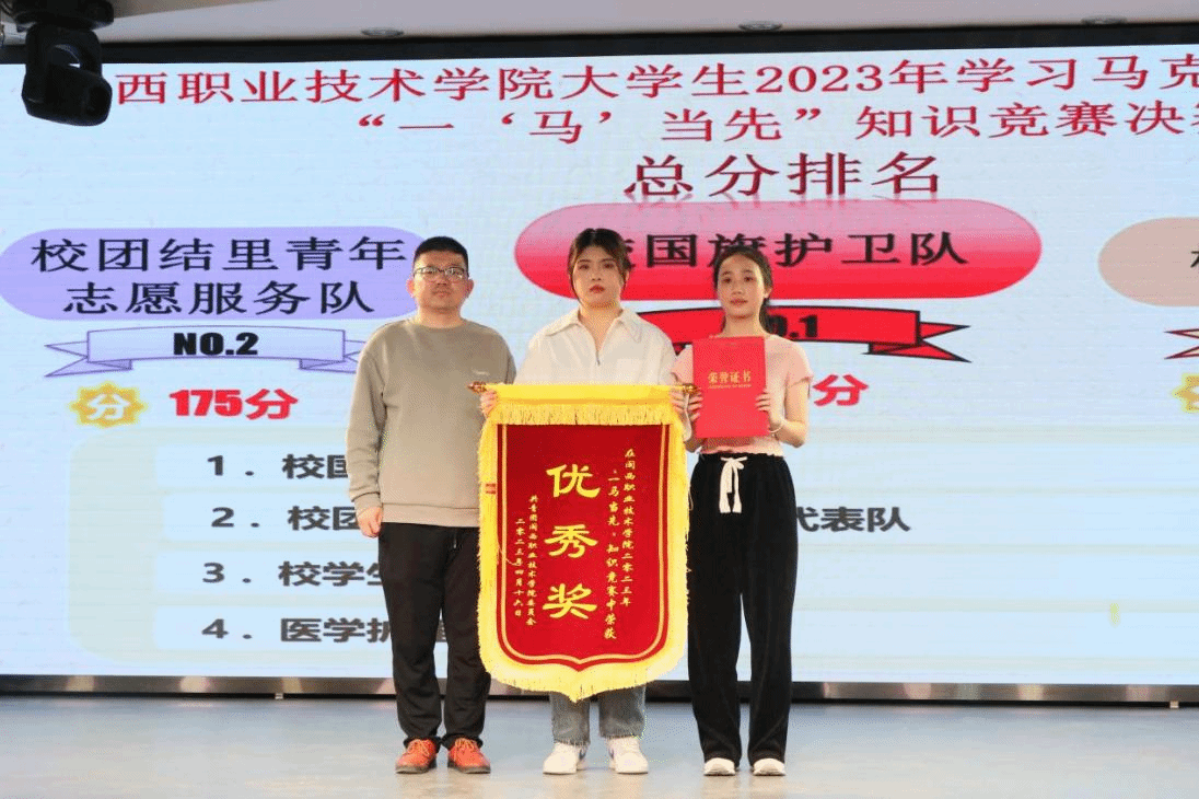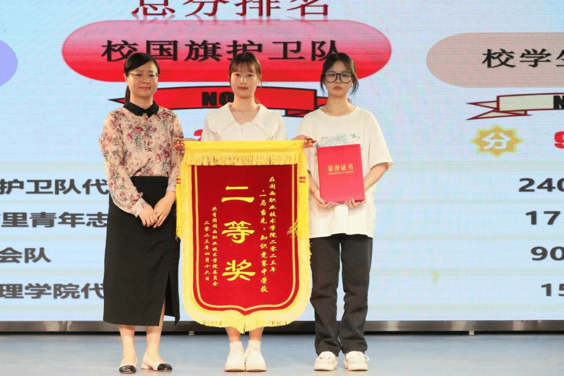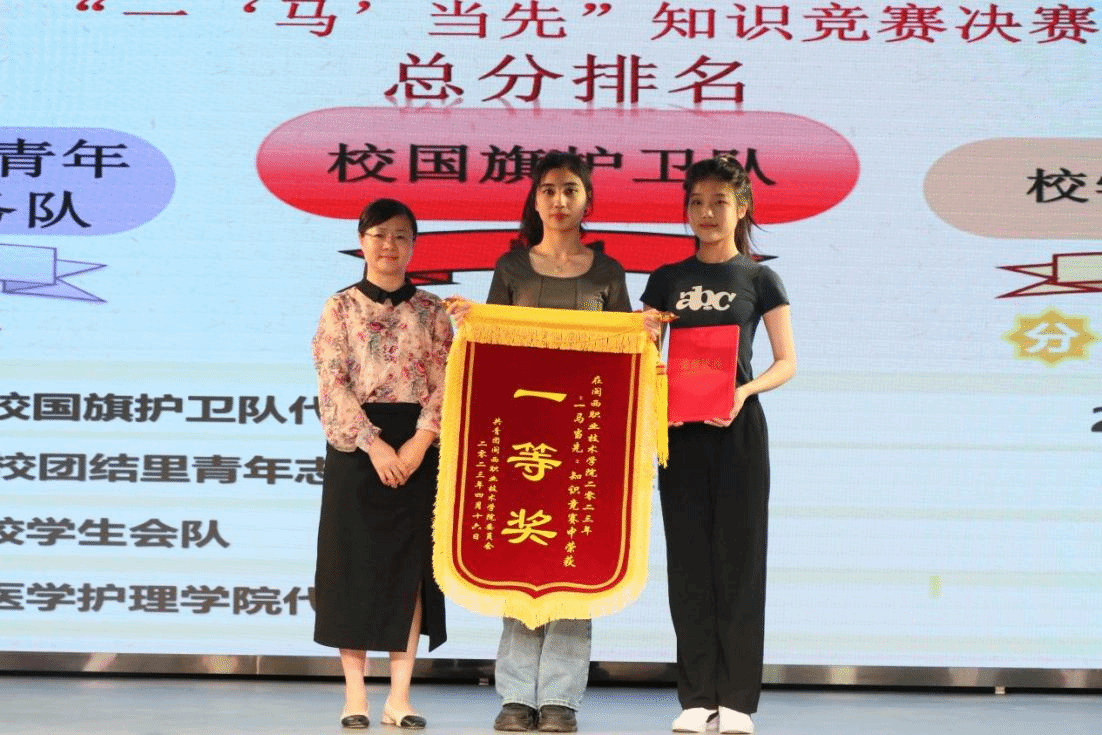 决赛设“个人必答题”“抢答题”“团队互选题”“风险题”等4个环节。比分你追我赶,交替上升。观众们也不甘示弱,踊跃参与。最终,校国旗护卫队荣获一等奖、校团结里青年志愿服务队荣获二等奖、校学生会代表队荣获三等奖,医学护理学院医心医意队荣获优秀奖。