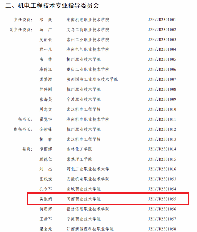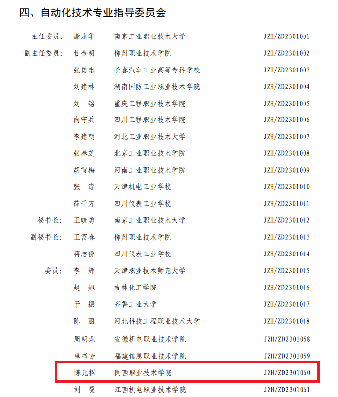 近日,机械工业教育发展中心发布《关于成立全国机械职业教育教学指导委员会专委会的通知》(机职指委〔2023〕2号),遴选确定了新一届机械行指委机电工程技术、自动化技术等8个专业指导委员会和校企合作、教科研2个专门工作委员会人选,智能制造学院共有2名教师入选。其中福建省“最美教师”吴淑娟副教授被聘机电工程技术专业指导委员会委员,智能制造学院院长陈元招教授被聘自动化技术专业指导委员会委员。