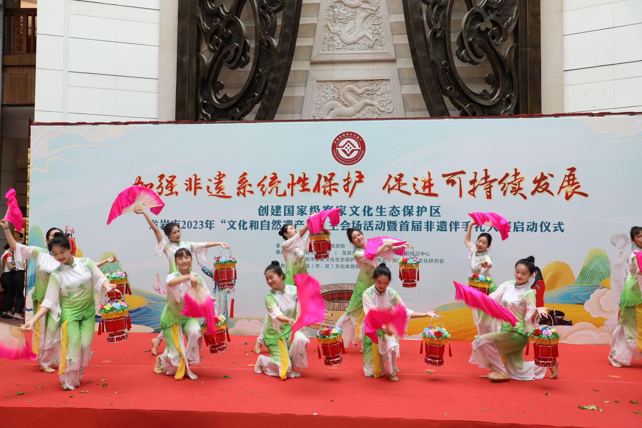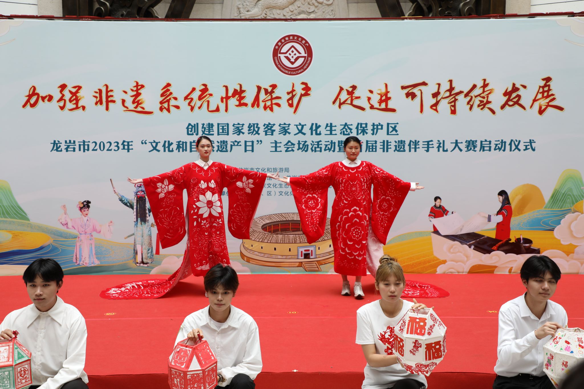 在主会场活动,MG冰球推送了龙岩剪纸时装秀及采茶扑蝶表演两个非遗展演节目。同学们以饱满的热情、精彩的演出,获得了现场观众的充分认可与肯定,赢得了阵阵掌声。非遗展演节目结束后,举行了主会场活动启动仪式,龙岩市文化与旅游局授予了MG冰球“龙岩市非物质文化遗产传承基地”的牌匾。