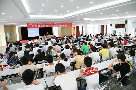 5月20日下午,我院党委理论学习中心组专题(扩大)报告会在学术交流中心举行。福建省委党校郑镇教授作了题为《我国社会转型中道德正能量的培育与弘扬》专题辅导报告。在家院领导来永宝、吴新业、刘路永、卢兆梅、李贞鑫,院长助理李伟闽,全体中层干部,思政部教师、辅导员、政工干部、学生干部代表等共180人参加会议。报告会由副院长卢兆梅主持。