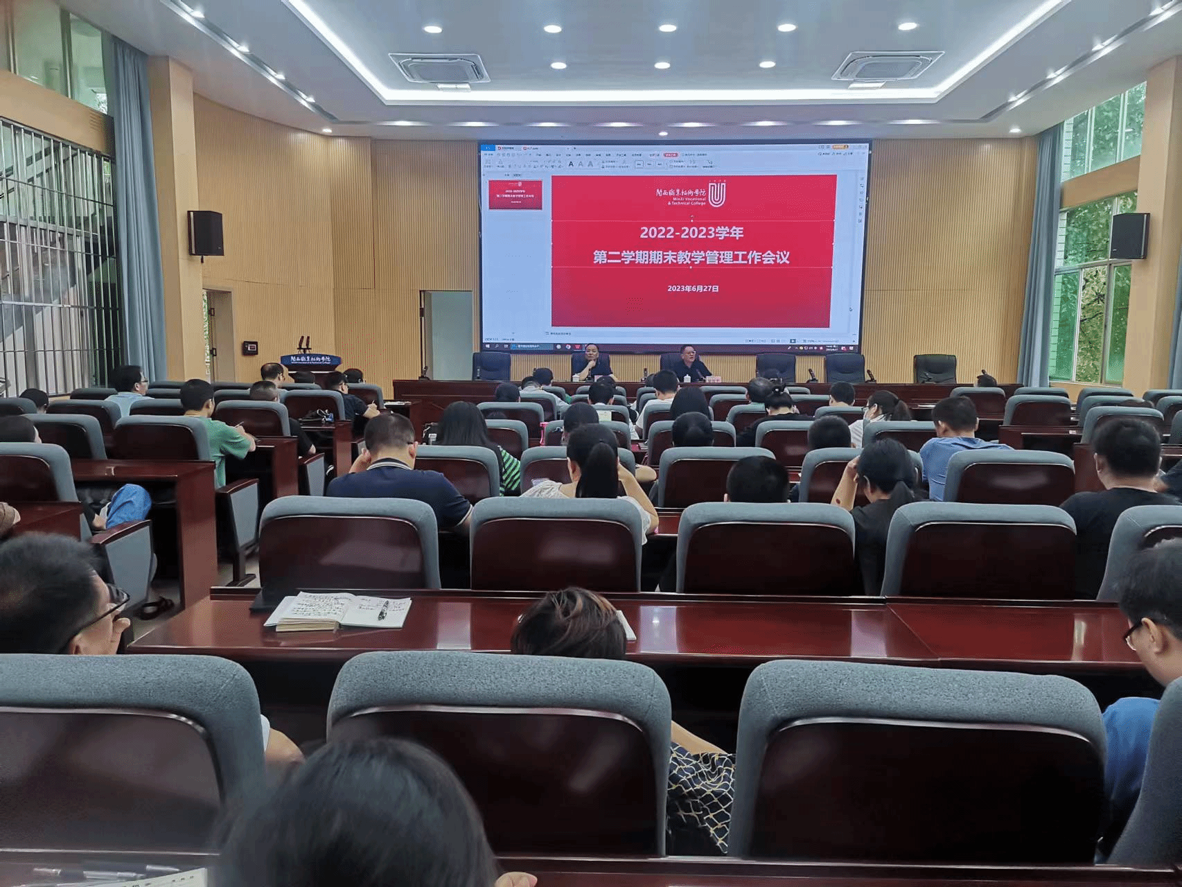 为贯彻落实“双高”建设任务及“三教”改革攻坚年行动计划工作方案,深入开展“深学争优、敢为争先、实干争效”行动,为更好地完成期末管理和暑期各项工作,6月27日下午在协成楼二楼第一会议室召开本学期期末教学管理工作会议。梁俊平校长、各教学单位部门负责人、分管教学副院长、专业群负责人、专业主任、教学秘书、教务处全体处室人员参加了会议。
