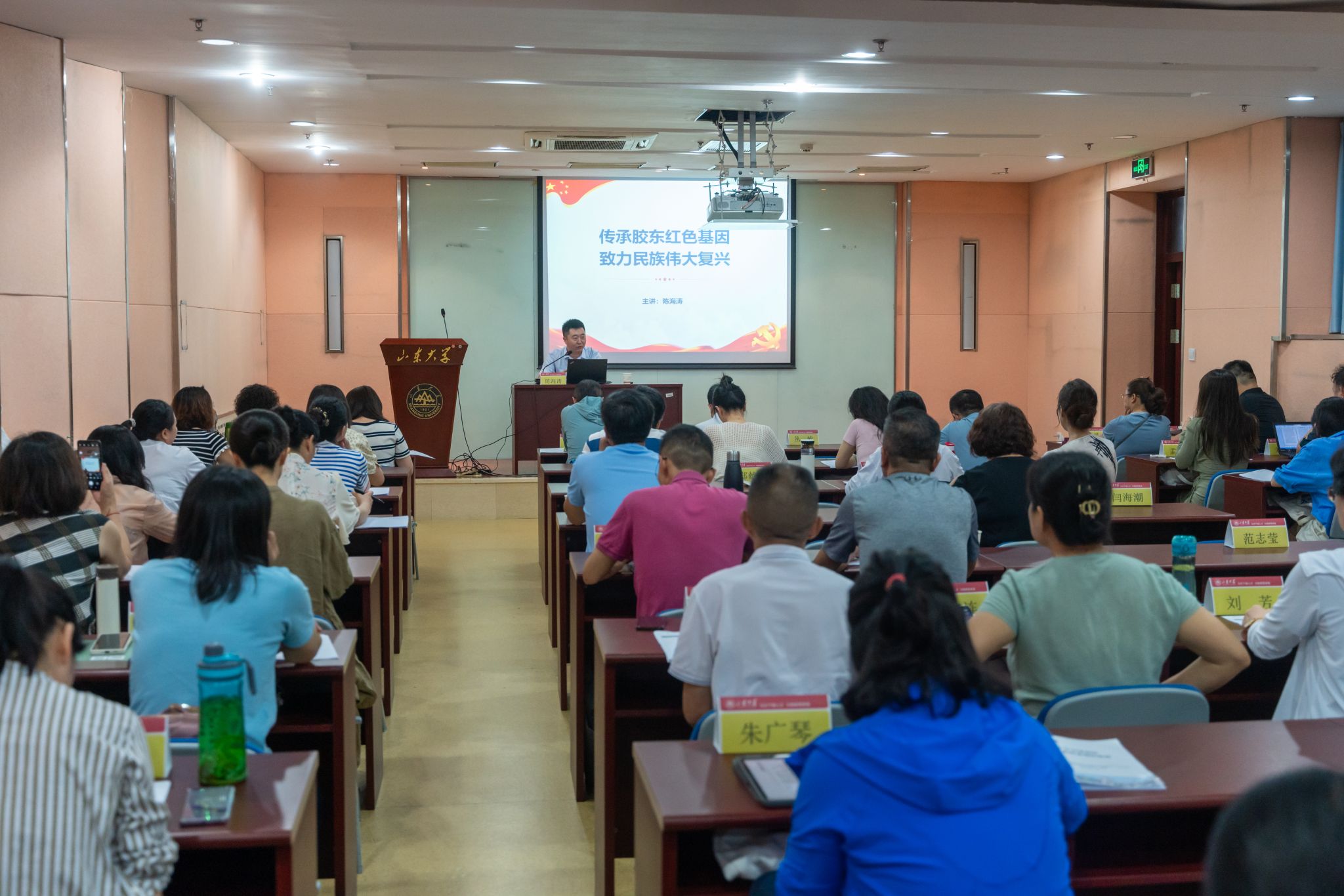 此次暑期研修活动分为专题学习和现场教学两个部分,7月9日上午,教师们在山东大学听取了烟台市委党校陈海涛老师作的“弘扬胶东革命精神致力民族伟大复兴”的主题讲座。陈海涛老师围绕“波澜壮阔的胶东革命斗争”这一主题,以贡献为切入点,从胶东党组织创建和革命发动走在全国前列、胶东根据地消灭和牵制了大量敌人、胶东为全国革命提供了巨大的人力财力物力支撑、胶东子弟兵成长和发展为人民解放军四大主力、胶东根据地发展了生机勃勃的新民主主义文化五方面深入阐述了胶东地区发生的重要历史事件和为中国革命作出的重要贡献,从忠诚坚定、不畏艰难、敢为人先、无私奉献四个方面诠释了胶东革命精神的内涵,高度凝炼了在胶东革命斗争史中一代代共产党人坚定理想信念、不断接续奋斗的伟大历程。