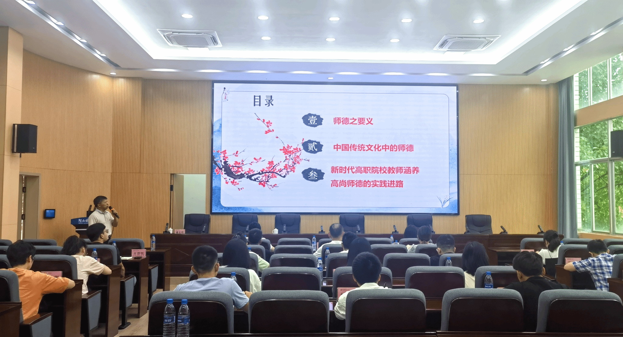在集中学习培训阶段,教师工作处负责人以《涵养高尚师德 造就“良匠之师”》为题给新入职教师讲授入职第一课,组织新入职教师深入学习习近平总书记关于师德师风建设的重要论述。在专题讲授中,他从师德的概念、中国传统文化中的师德内涵诠释师德之要义,从高职院校教师角色、教师职业能力、教师职业成长阐述教师涵养师德的具体路径。组织新入职教师学习《新时代高校教师职业行为十项准则》,通报教育部公开曝光的违反教师职业行为十项准则典型案例,开展师德警示教育。
