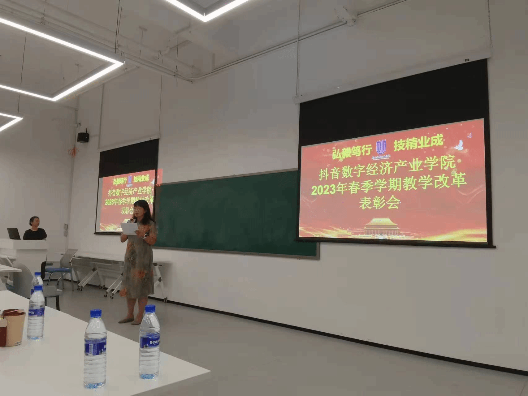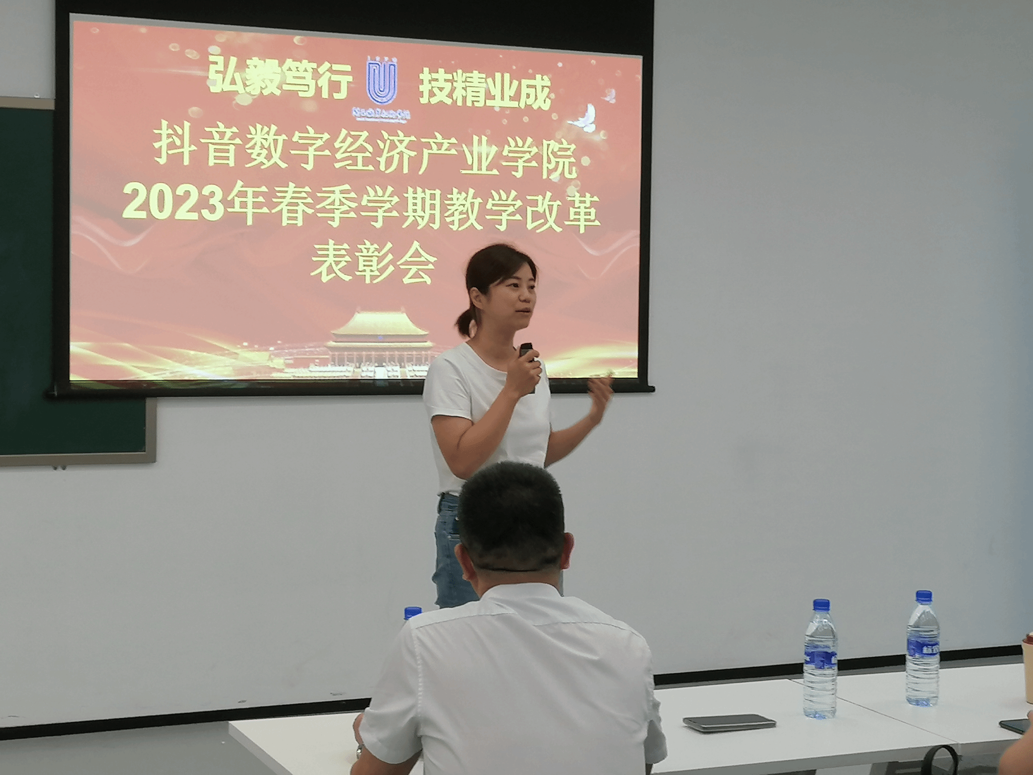 抖音数字经济产业学院院长(企业方)、抖音集团企业社会责任部院校培训总监蔡文婷在会上介绍了本次教改过程,分享了本次教改的艰辛和喜乐。同时,对全体教师充分理解并积极参与本次教改活动表示衷心感谢,希望更多老师更加积极、更加踊跃参与后续教学改革,希望抖音数字经济产业学院课程能如期顺利惠及全校。