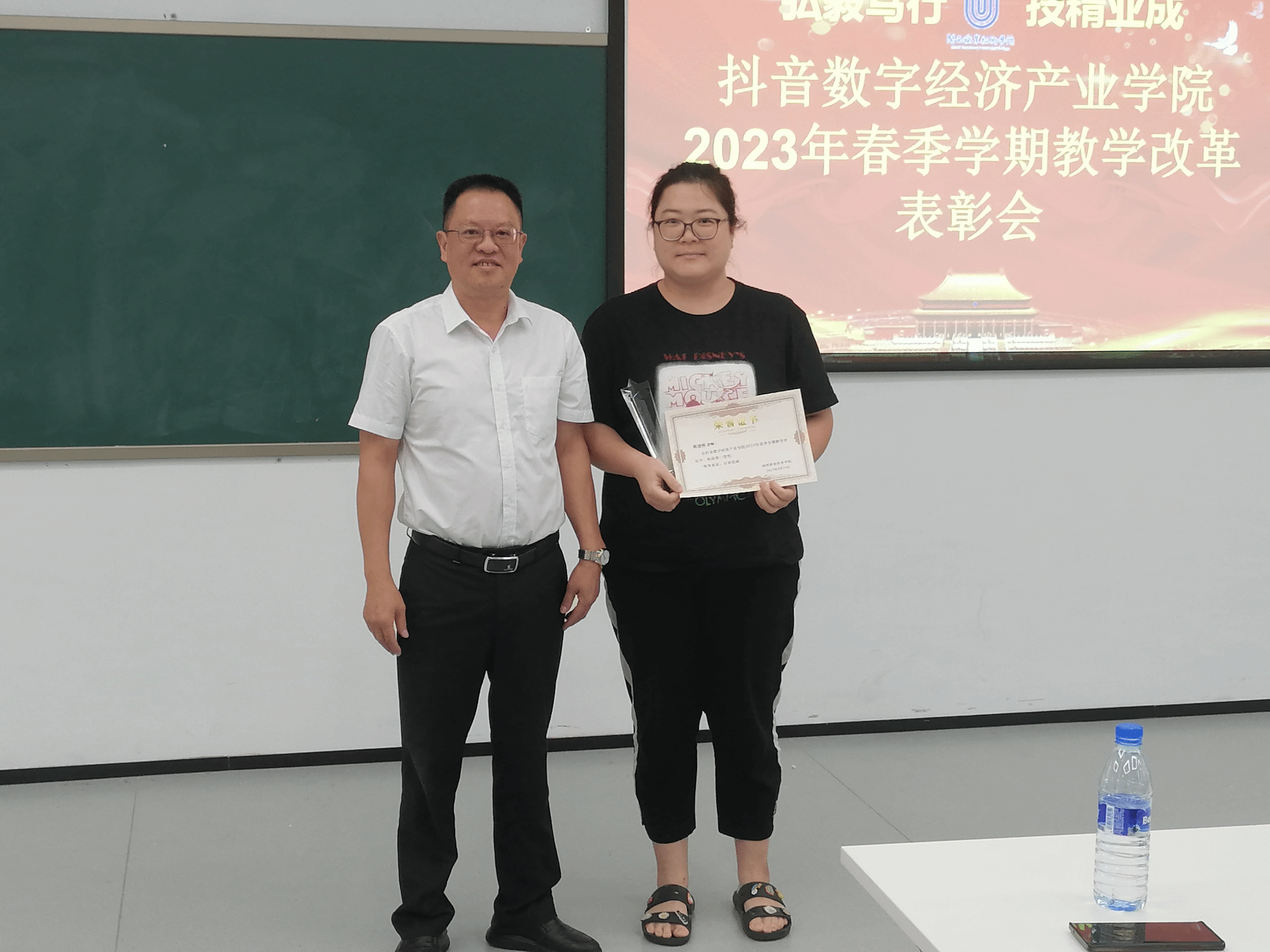 会上,财经商贸学院院长郭玲娜宣读了《关于给予抖音数字经济产业学院2023年春季学期教学改革奖励的决定》,宣布由抖音集团出资9.8万元奖励我院15位在教学改革中付出辛勤汗水并取得突出贡献的教师,其中陈媛嫔老师获得金奖,奖金3万元,其他教师获得2000-20000元不等的奖金。校长梁俊平亲自为金奖获得者陈媛嫔老师颁发奖金、奖杯和获奖证书。