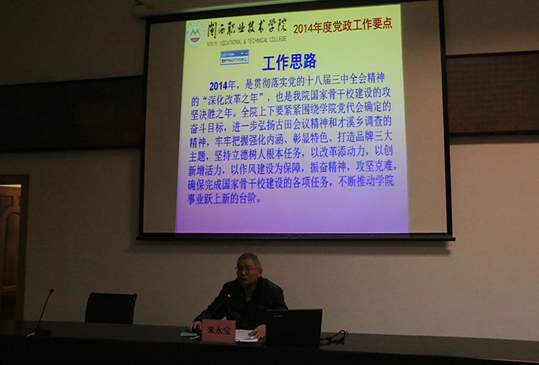 院长来永宝主持会议并作2014年工作部署讲话。他指出,2014年,是贯彻落实党的十八届三中全会精神的“深化改革之年”,也是我院国家骨干校建设的攻坚决胜之年。全院上下要紧紧围绕学院党代会确定的奋斗目标,进一步弘扬古田会议精神和才溪乡调查的精神,牢牢把握强化内涵、彰显特色、打造品牌三大主题,坚持立德树人根本任务,以改革添动力,以创新增活力,以作风建设为保障,振奋精神,攻坚克难,确保完成国家骨干校建设的各项任务,不断推动学院事业跃上新的台阶。他从“把握发展和工作大局”、“强化骨干校建设工作机制”、“全面推进教育教学改革”、“加强招生就业工作”、“提升服务保障能力和水平”、“推进党建思政工作和精神文明建设”等六大方面进行部署。他强调,今年工作不同寻常,全面深化改革任务重,国家骨干校两部验收责任大,群众路线实践教育活动要求严,并校及人事调整干部选用难点多。我们一定要在党委领导下,群策群力,勇往直前,不断开创学院工作的新局面,为推动学院事业加快发展,造福老区人民作出新的更大贡献。会上,他还就对全院教职工提出四点希望:要弘扬主旋律,形成干事创业的良好氛围;要顾全大局,形成干事创业的基本环境;要提高执行力,形成干事创业的前置条件;要勤俭办学,形成干事创业的集体品德。