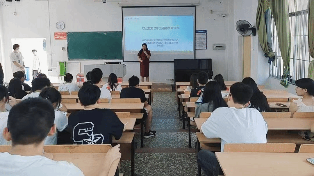 宣讲伊始,罗芳香老师针对职业教育法的相关内容展开宣讲,其中包括:职业教育的体系、职业教育的实施、职业教育的保障以及法律责任等六个方面。其中重点提到了职业教育法对高职学生的法律保障、职业道德和职业法规还提到了“深化产教融合、校企合作”的重要性:强调“融合”就是要成为一体,企业与学校共同投入,共同制定人才方案,共同进行人才培养,达到共建共赢的效果。接下来林松警官则做预防电信诈骗主题宣讲,主要从校园内常见的十种诈骗类型、有奖问答环节等四个方面展开。其中侧重讲述了校园内常见的几种诈骗类型,旨在让同学们能够有效预防身边可能出现的电信网络诈骗现象。