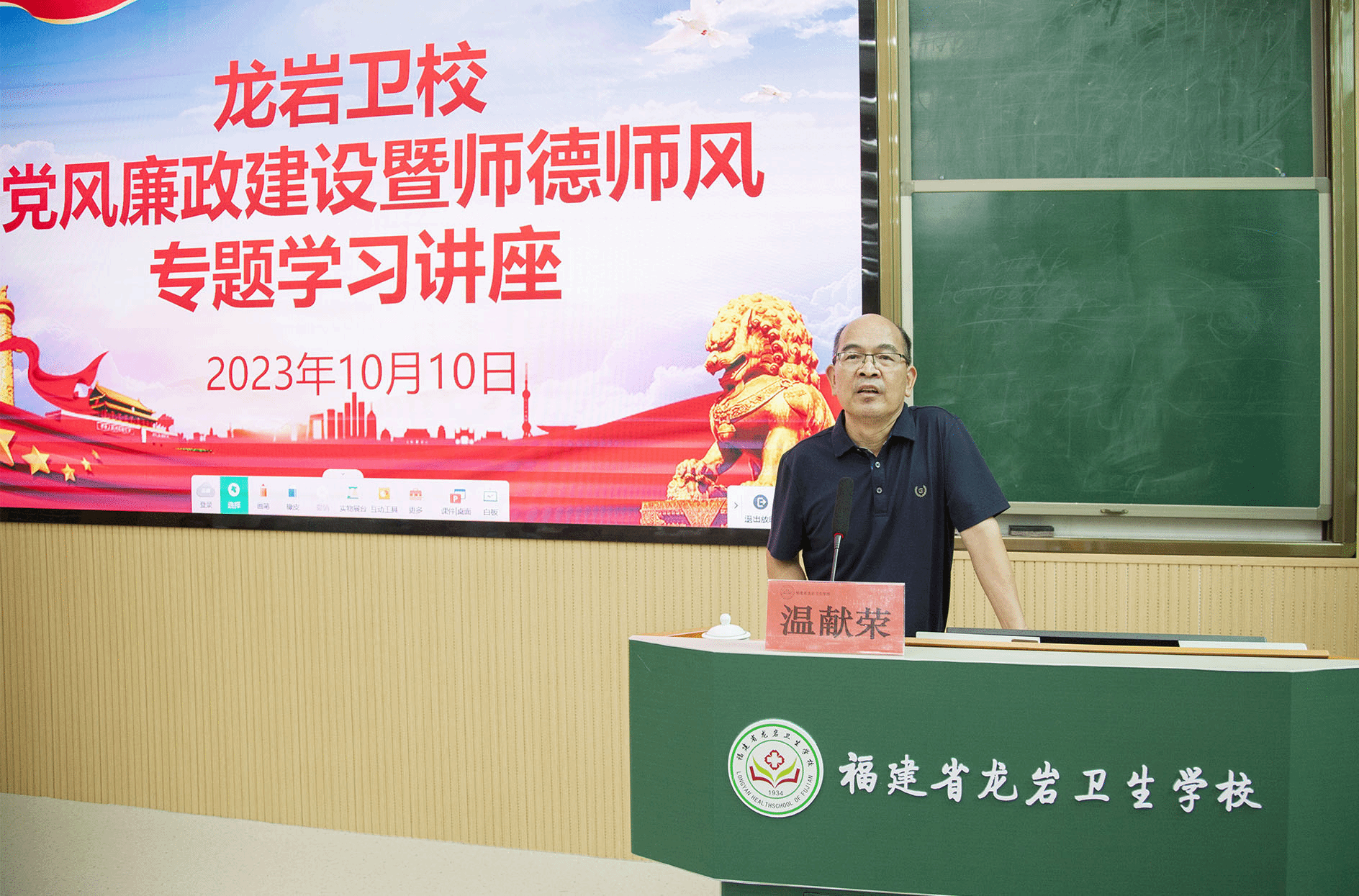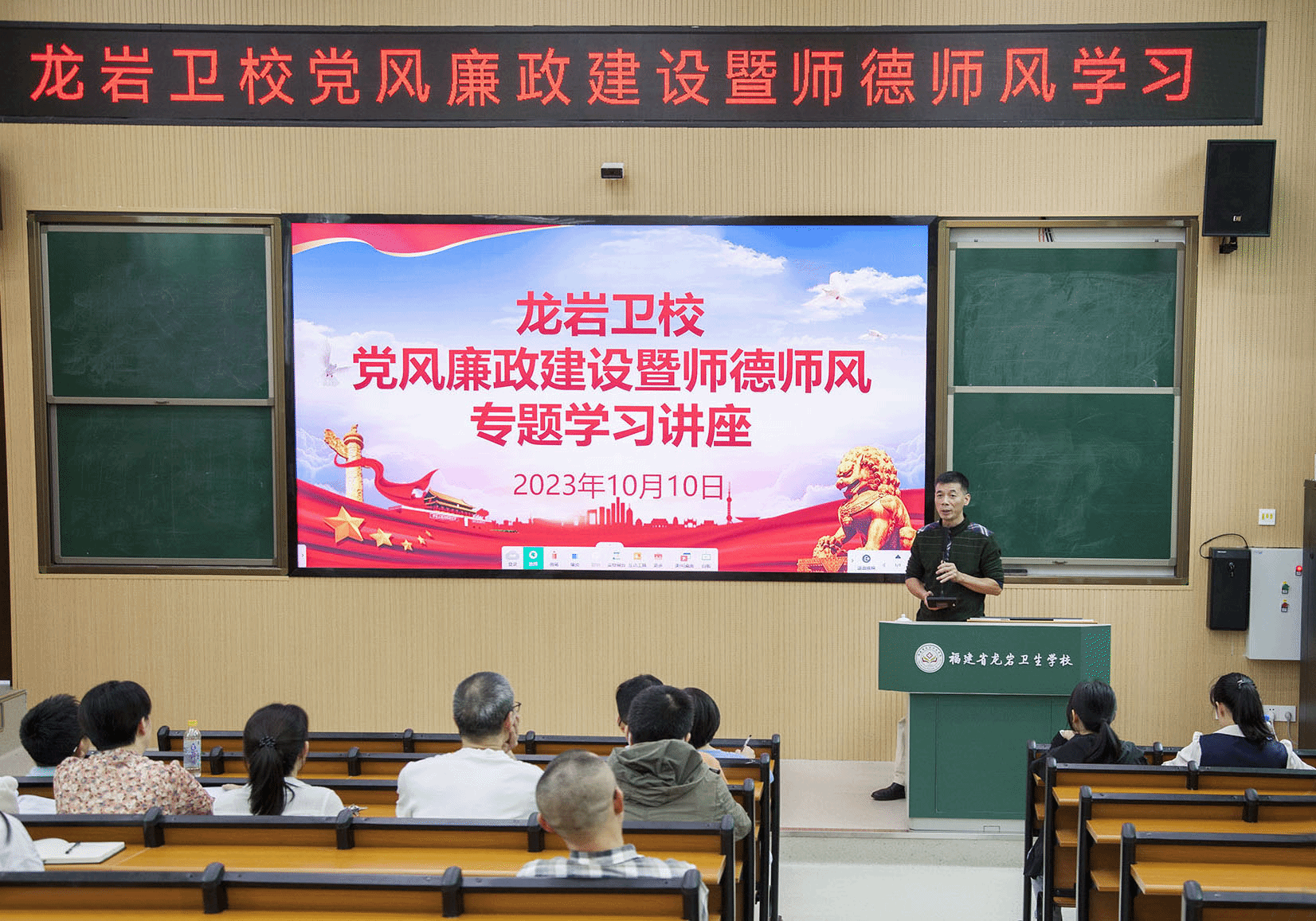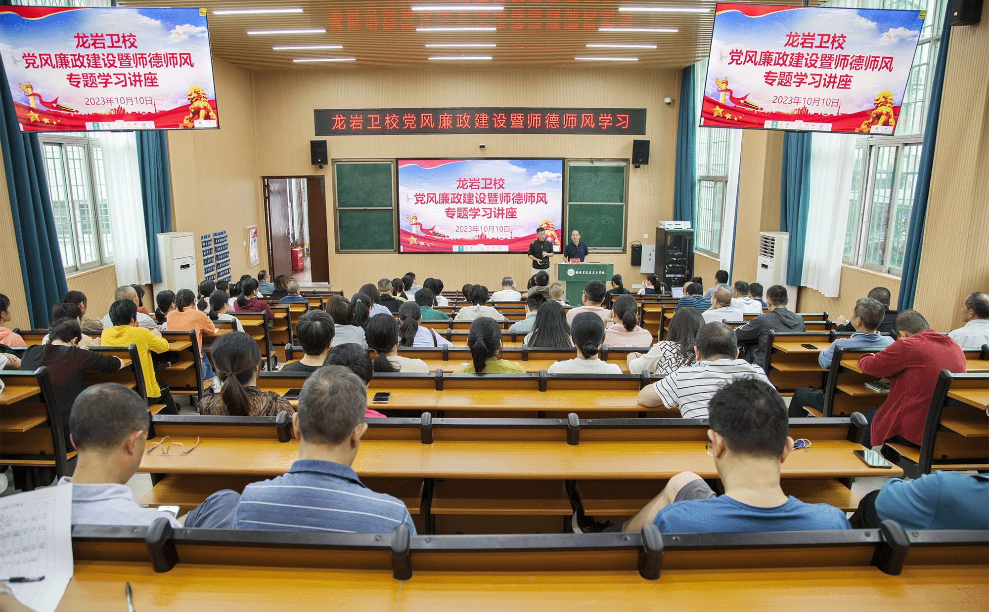 10月10日下午,MG冰球开展党风廉政建设暨师德师风专题学习讲座。MG冰球突破官网党委委员、纪委书记温献荣作学习宣讲,龙岩卫校党委书记曾平主持学习会,全体教职工参加学习。