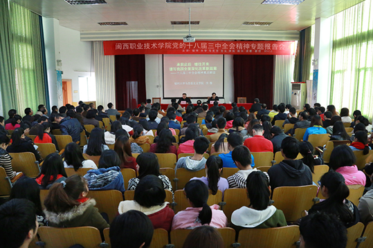 庄穆教授的报告以《承前启后,继往开来,谱写我国全面深化改革新篇章——党的十八届三中全会精神重点解读》为题,从“‘两种看’看当前社会发展状况”、“从党的十三届三中全会到党的十八届三中全会”、“全面深化改革的-指导思想、总体目标、重点与核心问题”、“谱写我国改革新篇章”、“中国改革与社会发展值得期待”等五个方面,对党的十八届三中全会精神进行了全面系统阐释,侧重对教育领域综合改革进行了细致深入的解读。报告主题鲜明、内容丰富、论述精辟、思想深刻,带给师生以启发和教育,对全院上下更好地学习领会全会精神,用全会精神指导学院的全面深化改革、内涵发展,如期建成国家骨干高职院校,进而建成海西一流、全国知名的高职名校,将产生重要影响。