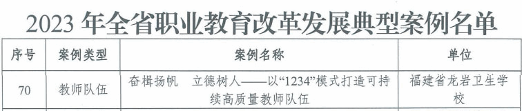 福建省职业技术教育中心公布了2023年全省职业教育改革发展典型案例名单,龙岩卫校报送的《奋楫扬帆 立德树人——以“1234”模式打造可持续高质量教师队伍》入选“教师队伍”类型典型案例,龙岩市中职学校仅此一例。这是该校继打造“党建引领 立德树人 构建1133育人新模式”、省级周清劳模工作室和市级教学创新团队后的又一重要成果。