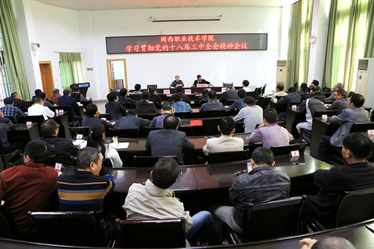 会议要求,全院上下要根据中央、省委、市委的部署,把认真学习领会、全面贯彻落实党的十八届三中全会精神作为当前和今后一个时期重大的政治任务抓紧抓好。要认真学习文件。组织党员干部认真研读习近平总书记重要讲话,原原本本学习全会公报和《决定》全文,努力学深学透。深入开展“先学先做先改”活动。按照中央八项规定和省委“马上就办”的要求,治理懒散庸软,进一步转变作风,同时结合贯彻落实三中全会精神,把改革融进去,为正在开展的“先学先做先改”活动,以及明年开展的党的群众路线教育实践活动增添新内容。要加强宣传解读。充分利用党团活动时间,中心组学习,思政理论课,各类培训班,讲座和板报、广播、网络等宣传舆论阵地组织宣讲、研讨、培训,全面准确解读三中全会精神,把学习党的十八届三中全会精神与学习贯彻党的十八大精神、习近平总书记系列重要讲话精神和学习贯彻即将召开的全国职教大会紧密结合起来,最大限度凝聚广大干部师生的共识,为我院改革顺利推进营造和谐氛围。要深刻领会精神。全面深化我院的改革发展,引导党员干部、师生员工深刻领会全会重大意义和战略部署,深刻领会全面深化改革的指导思想和目标任务,深刻领会教育领域综合改革的重大部署,积极推进国家骨干校建设,积极推进系(部)二级管理,积极推进部门预算,积极推进专业技术职务的自主评聘。搞好基层班子和干部考核工作,为基层领导干部的选拔任用和轮岗交流打下基础。明确各项改革任务的路线图、任务书、时间表、责任人。要抓好岁末年初工作。以学习贯彻全会精神为动力,把贯彻落实全会精神与扎实抓好各项工作紧密结合起来,全面完成本学期及今年各项工作任务,认真做好高职入学考试录取工作,组织好省高职技能大赛参赛工作,主副修专业试点工作,认真谋划下学期及明年工作,牢牢掌握工作的主动权,继续保持我院国家骨干校建设和院改革发展的良好态势。