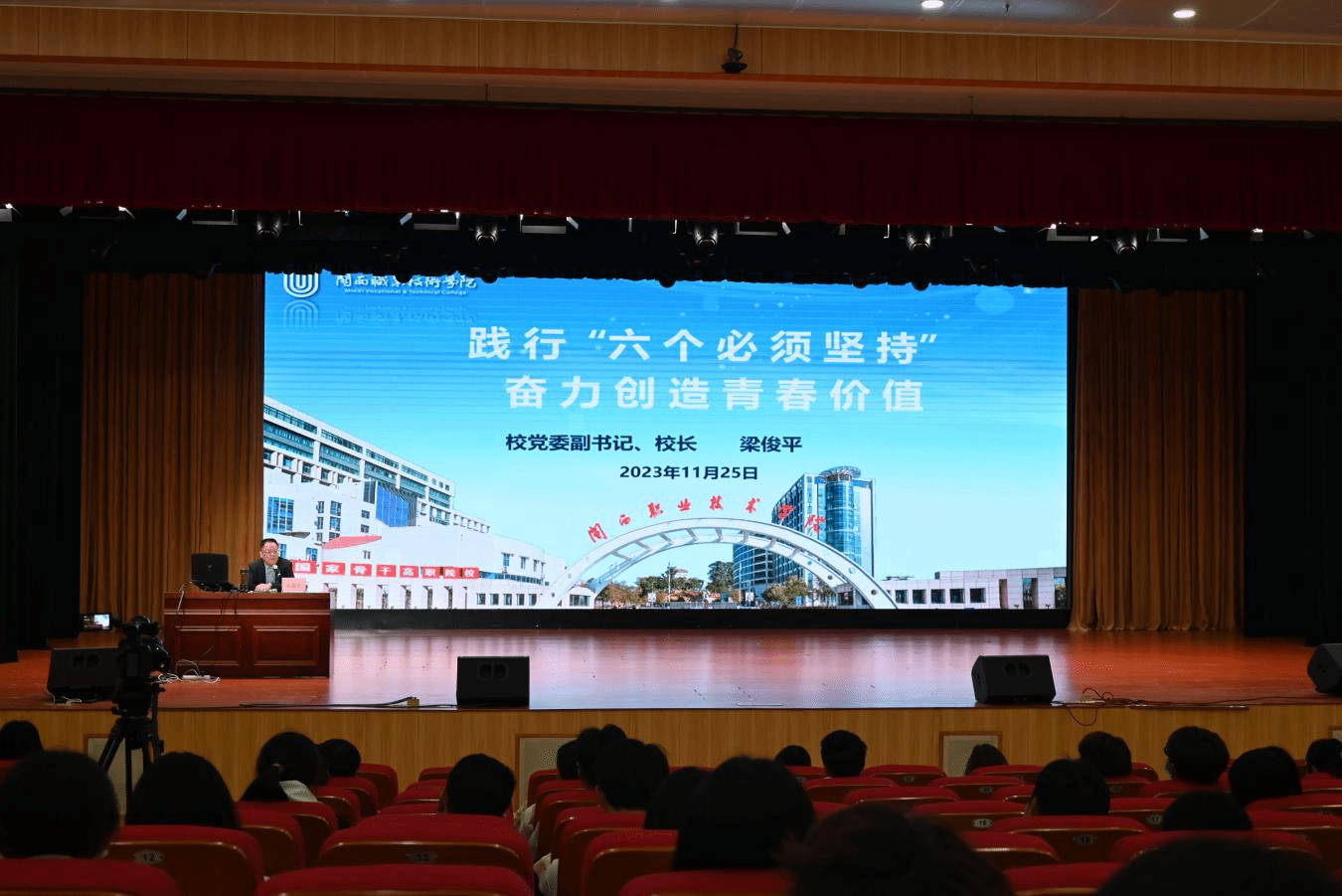 为扎实推进面向广大团员和青年开展学习贯彻习近平新时代中国特色社会主义思想主题教育走深走实,11月25日上午,梁俊平校长在大匠堂为“青春激昂心向党 齐心携手谱新篇”2023年团员和青年学习培训班440余位学员作了题为《践行“六个必须坚持” 奋力创造青春价值》的专题讲座。