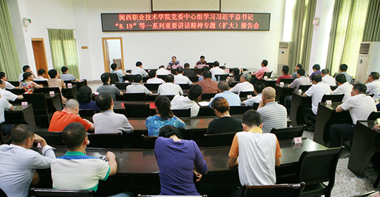 10月15日下午,院党委理论学习中心组举行学习习近平总书记“8.19”等一系列重要讲话精神专题(扩大)报告会。院领导马春延、吴新业、刘路永、卢兆梅、李贞鑫,院长助理李伟闽,全体中层领导干部等近80人出席听取了报告。龙岩市委讲师团副团长陈再兴应邀作专题报告。专题学习报告会由副院长卢兆梅主持。
