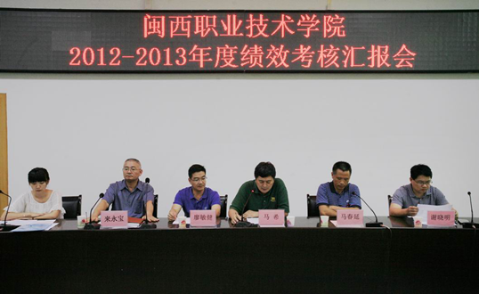 9月27日下午,我院在行政楼二楼会议室举行2012-2013学年度绩效考核汇报会。考核组带队领导、市委教育工委专职副书记(正处级)马希,考核小组牵头人、市教育工委副调研员廖敏健,考核组成员、市委教育工委组织部部长谢晓明,市委教育工委组织部干部林芳,院领导马春延、来永宝、刘路永、卢兆梅、李贞鑫,院长助理李伟闽,有关职能部门负责人和具体负责人员参加会议。会议由党委书记马春延主持。