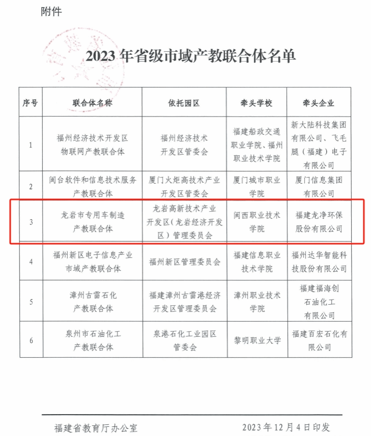 12月4日,MG冰球作为牵头学校、龙岩高新区(经开区)作为牵头园区、福建龙净环保股份有限公司作为牵头企业共同申报的“龙岩市专用车产教联合体”,经福建省教育厅综合评审,被正式确定为福建省省级市域产教联合体。