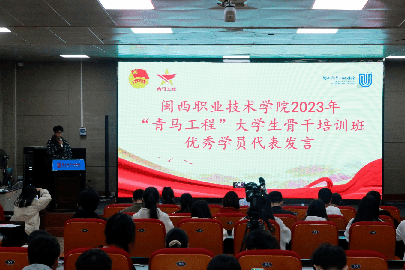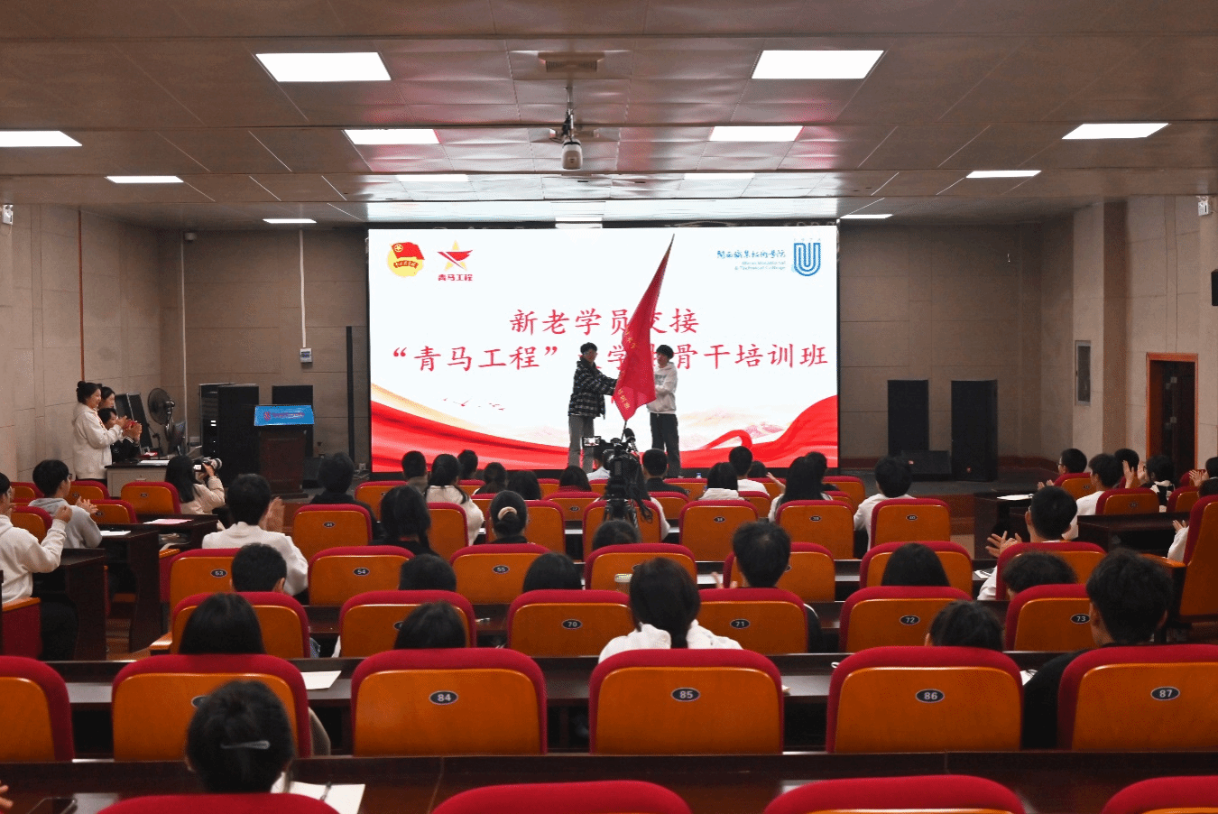 城乡建筑学院2021级学生林佳豪、财经商贸学院2022级学生潘金清分别作为老学员和新学员代表上台发言,并交接“青马工程”大学生骨干培训班旗帜。