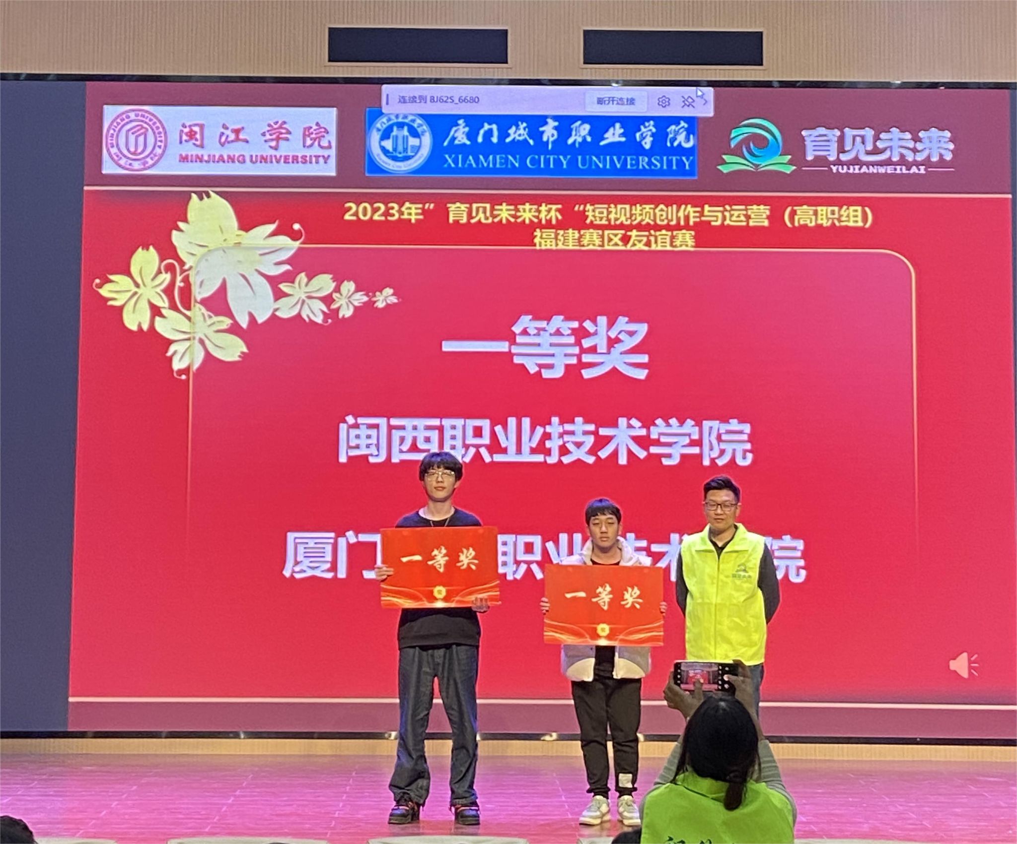 12月10日,2023年"育见未来杯"短视频创作与运营(高职组)福建赛区友谊赛在厦门城市职业技术学院落下帷幕。影视多媒体技术专业游婧敏、陈淑玲老师指导的刘思晴、吴培峰、陈涛、温莹莹团队在比赛中脱颖而出,以第一名的佳绩获得一等奖。