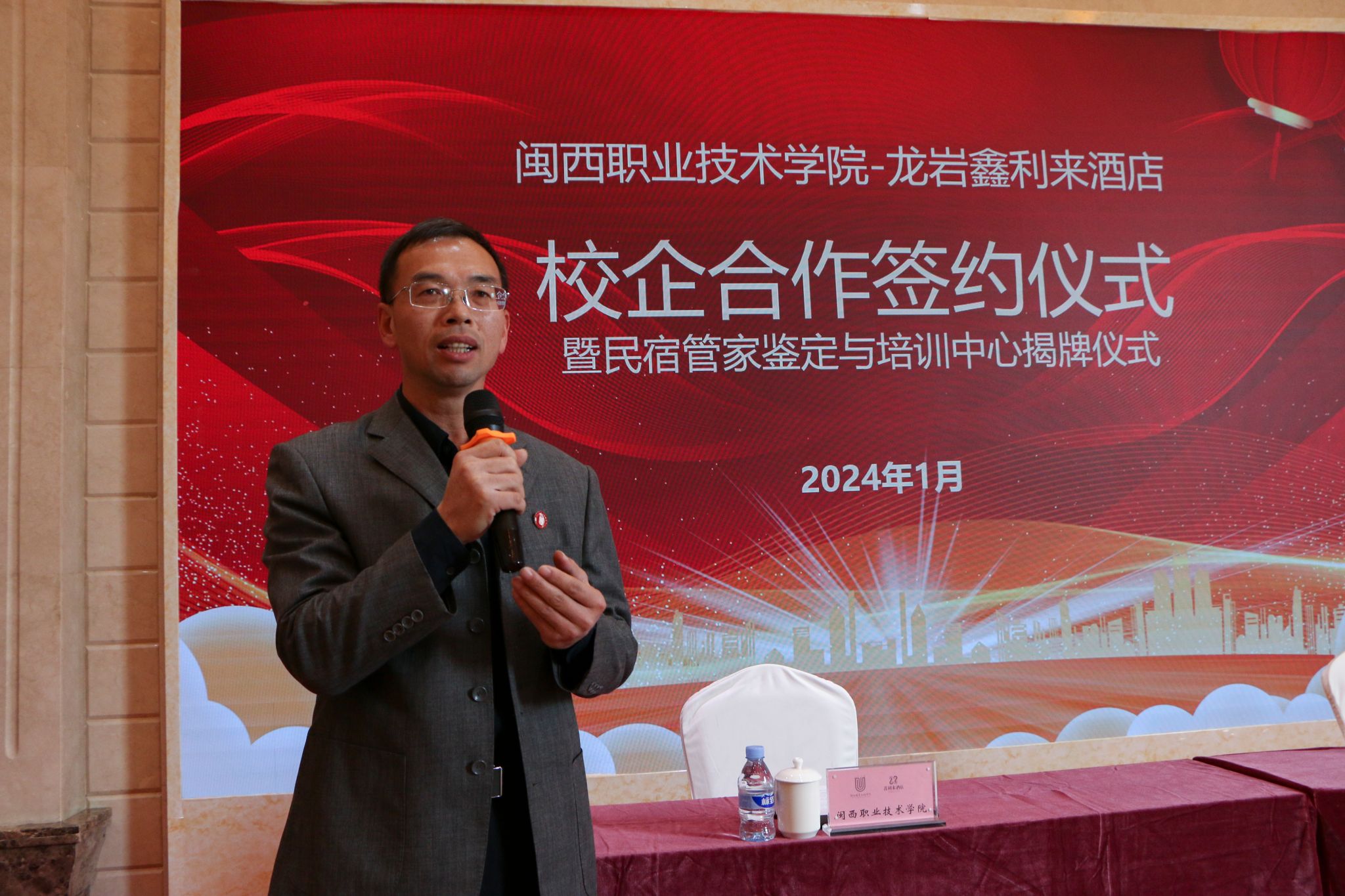 文化与旅游学院党委书记陈荣坤在致辞中介绍了文旅学院的发展情况以及“文旅民宿”专业群的建设情况,并对今后的合作进行了展望。鑫叶集团副总经理张志英高度赞扬了MG冰球突破官网的办学水平,对此次合作契机表示深切的支持与肯定,愿意积极配合,携手为龙岩民宿产业的发展贡献力量。