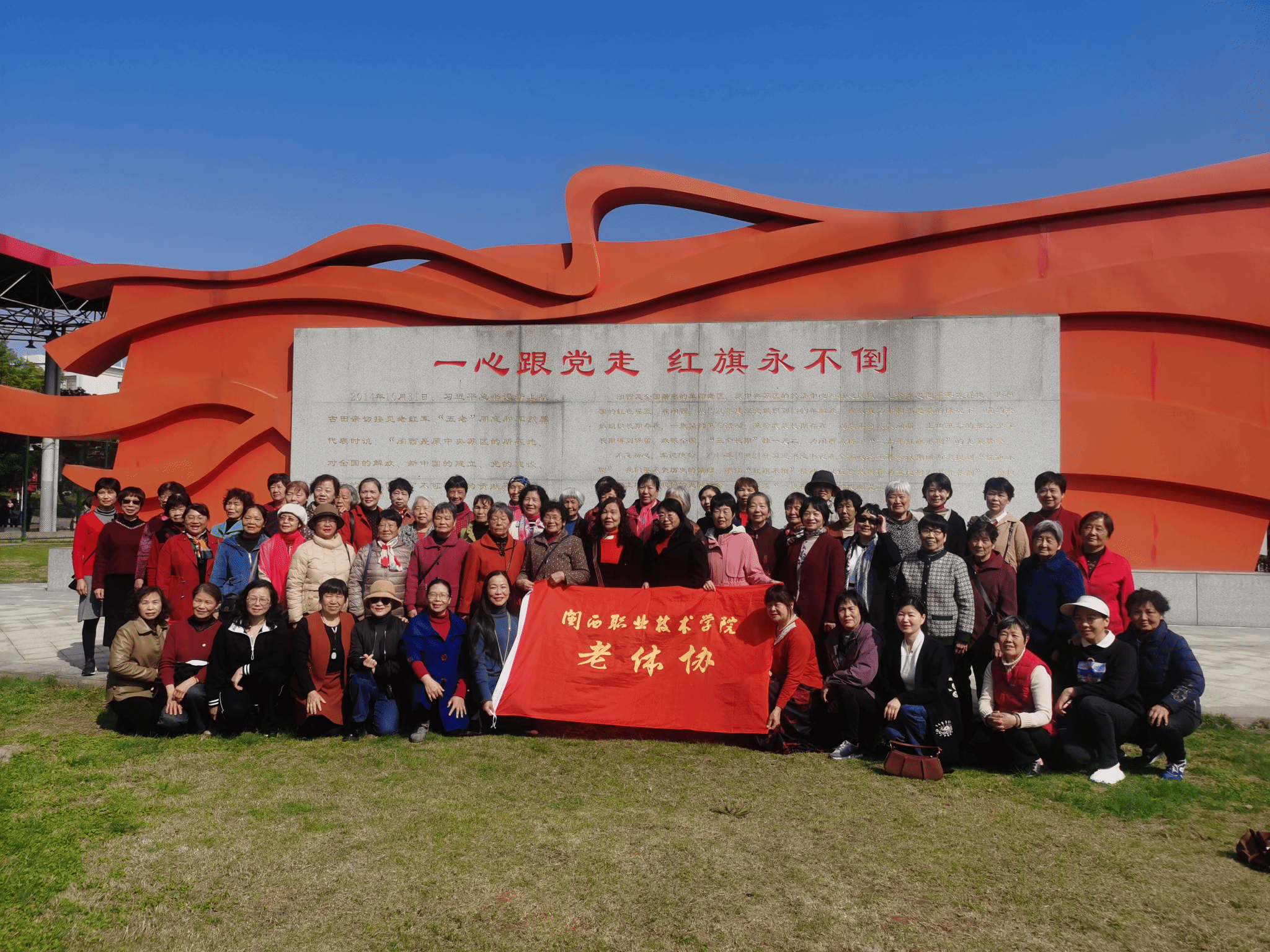 3月8日,久雨初晴,艳阳高照,MG冰球突破官网老体协组织离退休女同志开展“与美丽为伴 协幸福同行”庆“三八”校园健步行活动。上午9点,女同胞们陆续从学校西大门步行到辛耕楼,许久未见的老同事快乐相聚,兴奋之情溢于言表。她们相携游览团结渠、参观海绵校园,留下了一串串欢乐的足迹,“一心跟党走 红旗永不倒”雕塑下的合影留下了妇女同志们幸福的笑脸。