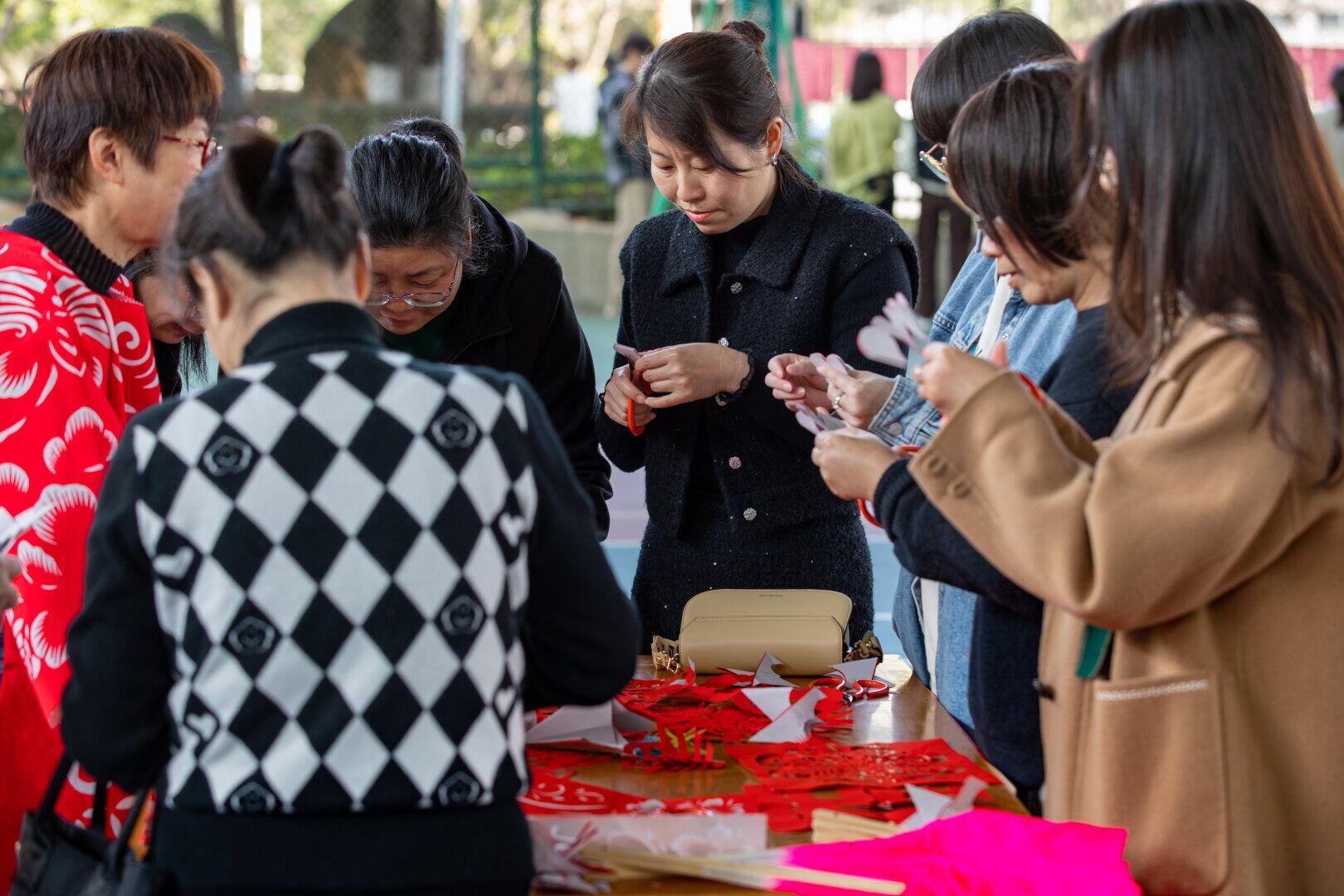 本次游园活动在轻松愉快的气氛中拉开了帷幕,共有女教职工近400人参与活动。游园项目将非遗文化与游戏相结合,包含谜语竞猜、剪纸、做香包、跳采茶灯舞等四项,有的检验知识储备,有的需要心灵手巧,亮点纷呈。现场气氛轻松愉快,逗趣的游戏、爆笑的场景,欢呼声喝彩声不绝于耳,处处洋溢着浓浓的节日气氛。