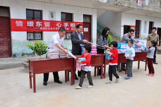 活动中,党委工作部、团委、学生会使用校园第二届公益义卖活动筹得的近两千元资金,购买了一批图书、文具、笔记本、地球仪等学习用品,送给挂钩村4所小学共计72名小学生。学院优秀校友刘高威先生,向当地的3所小学捐赠三台共计价值三千多元的净水器。学院爱心社为当地小学生印制了环保知识手册,向小学生宣传环保知识。