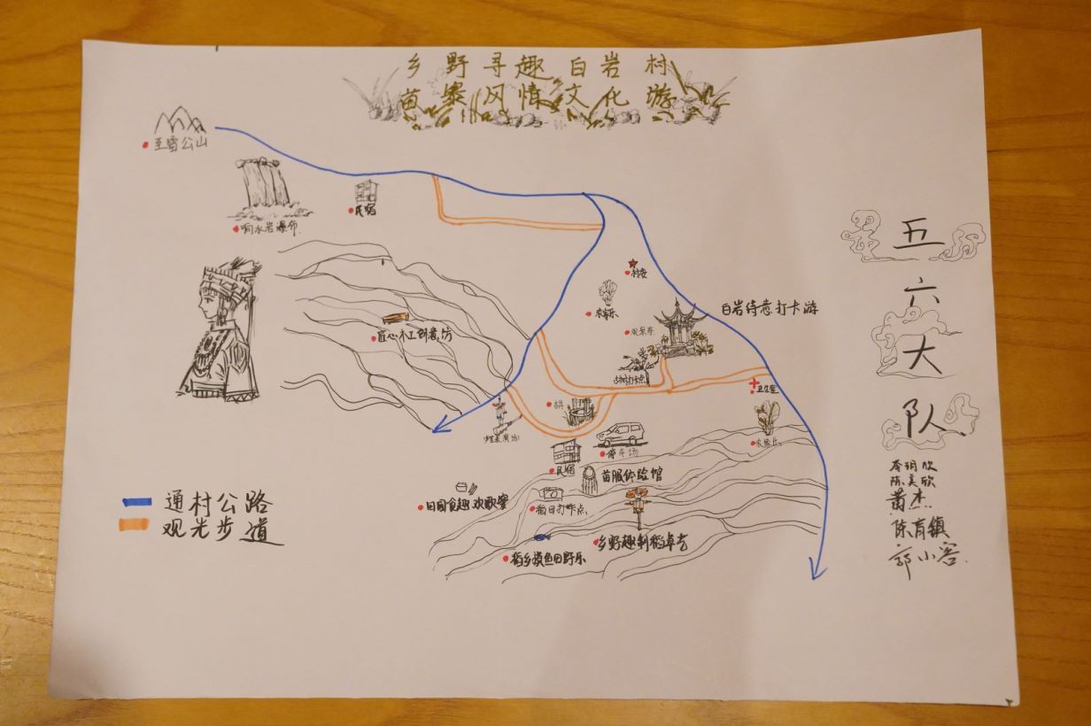 在对白岩村有了更多了解后,文旅学院同学根据村庄的地形环境以及可开发的资源进行了旅游线路设计, 用手绘的形式策划出适合白岩村的主题活动线路。