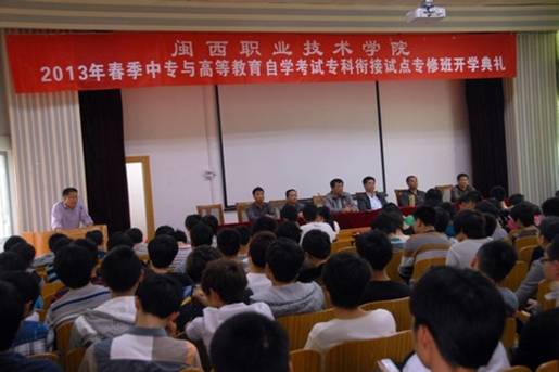 3月19日下午,MG冰球突破官网2013年春季中专与高等教育自学考试专科衔接试点专修班开学典礼在行政楼三楼会议室举行,院领导刘路永、张斯为,继续教育部、中专部有关负责人,中专部116名在校自考生参加了开学典礼。仪式由继续教育部主任陈汉章主持。